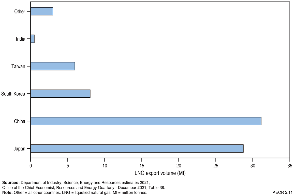 Nearly all of Australia’s LNG exports were delivered to Asian markets in 2020–21 (Figure 8). China accounted for 40 per cent (equivalent to 31.1 Mt) of Australian LNG exports, followed by Japan (37 per cent, equivalent to 28.7 Mt) and the Republic of Korea (10 per cent, equivalent to 8.1 Mt).