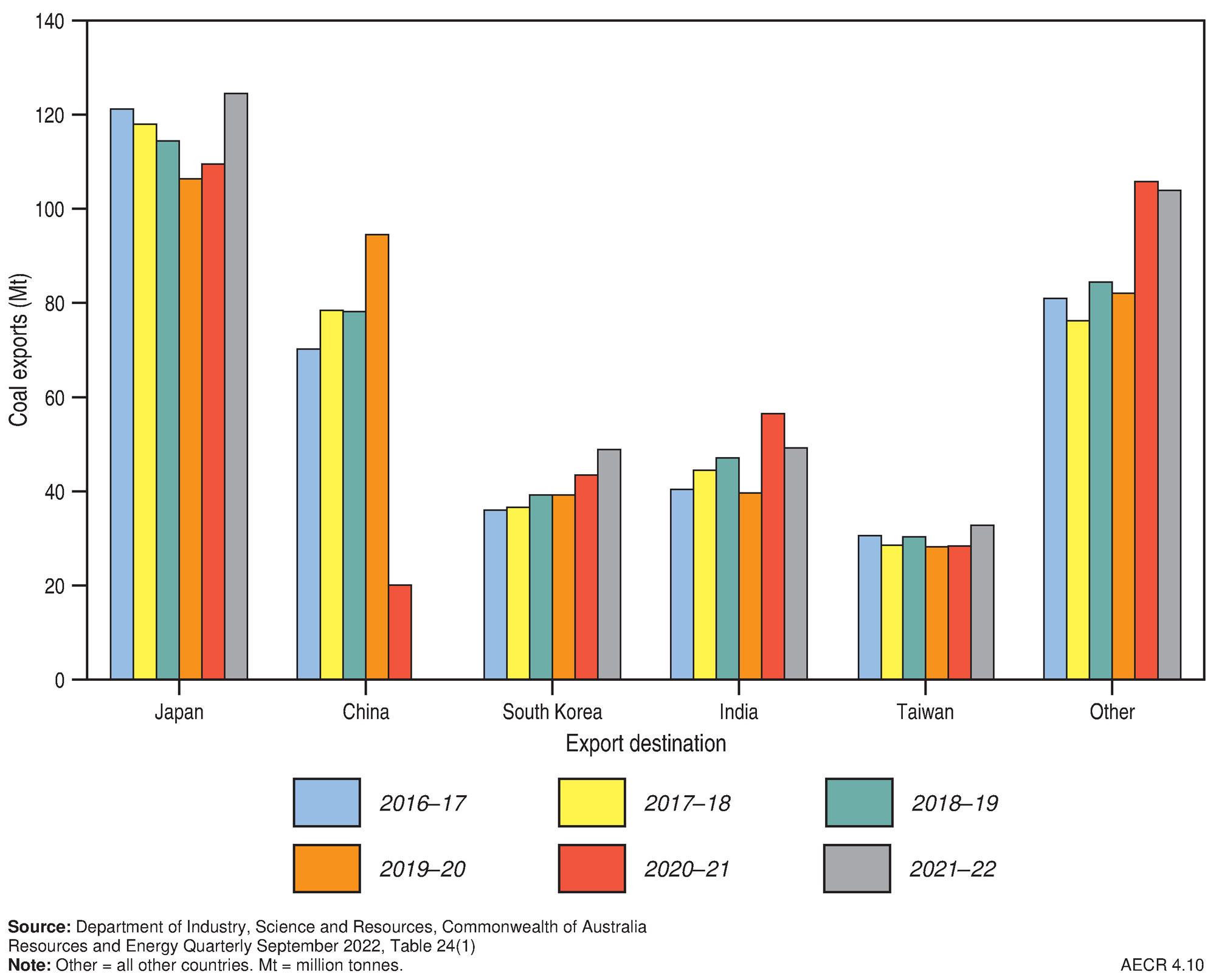 In 2020–21 Australia was the world’s largest exporter of metallurgical coal and the second largest exporter of thermal coal (Table 4; Department of Industry, Science and Resources, 2023).