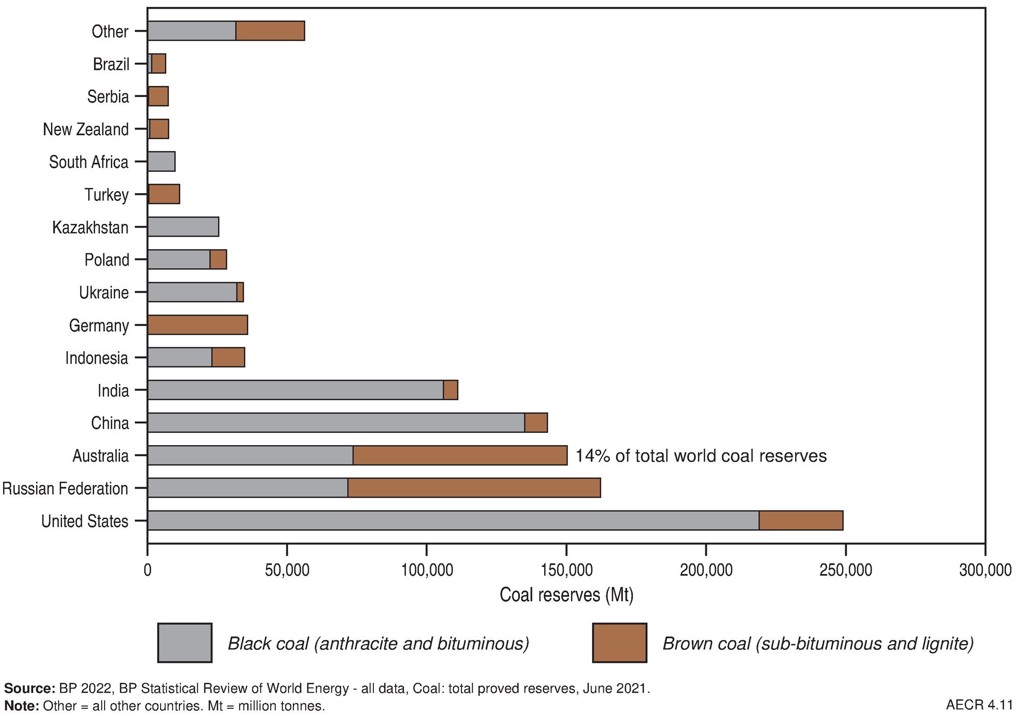 In 2021, Australia held 14 per cent of the world’s coal reserves (black and brown), ranking third behind the United States (23 per cent) and Russia (15 per cent) (bp 2022; Figure 11; Table 3).