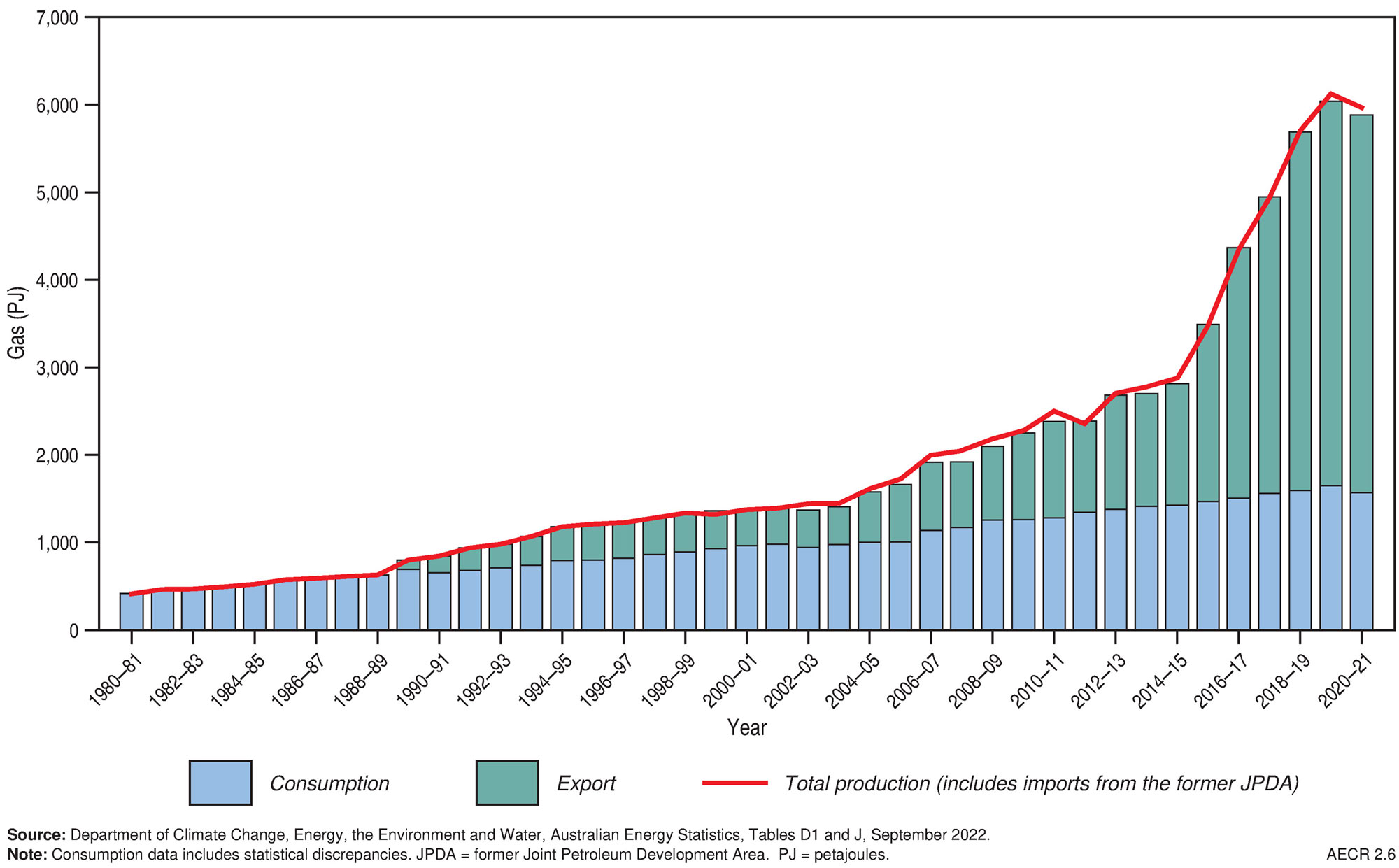 Recent trends in gas production are captured by the Australian Government’s Australian Energy Statistics on a financial year basis (Department of Climate Change, Energy, the Environment and Water, 2022). Natural gas production fell by 3.6 per cent to 5,730 PJ in the 2020–2021 financial year (Figure 3 and Figure 4) due to COVID-related reduced global demand for LNG exports and outages in LNG production at the Gorgon and Prelude facilities, but increased by an average of 9.7 per cent per year over the last decade (Department of Climate Change, Energy, the Environment and Water, 2022).
