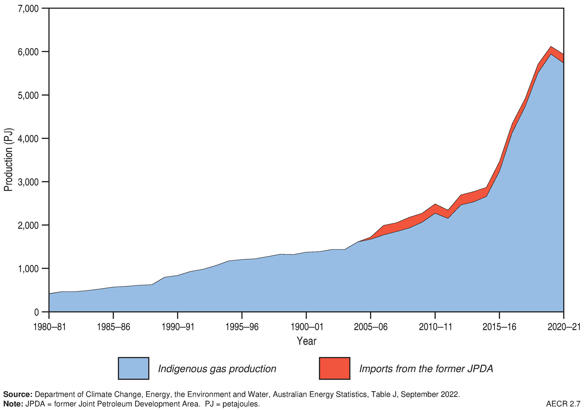 Natural gas imports are the gas produced in the former Joint Petroleum Development Area, which is liquefied in Darwin for export (Department of Climate Change, Energy, the Environment and Water, 2022).