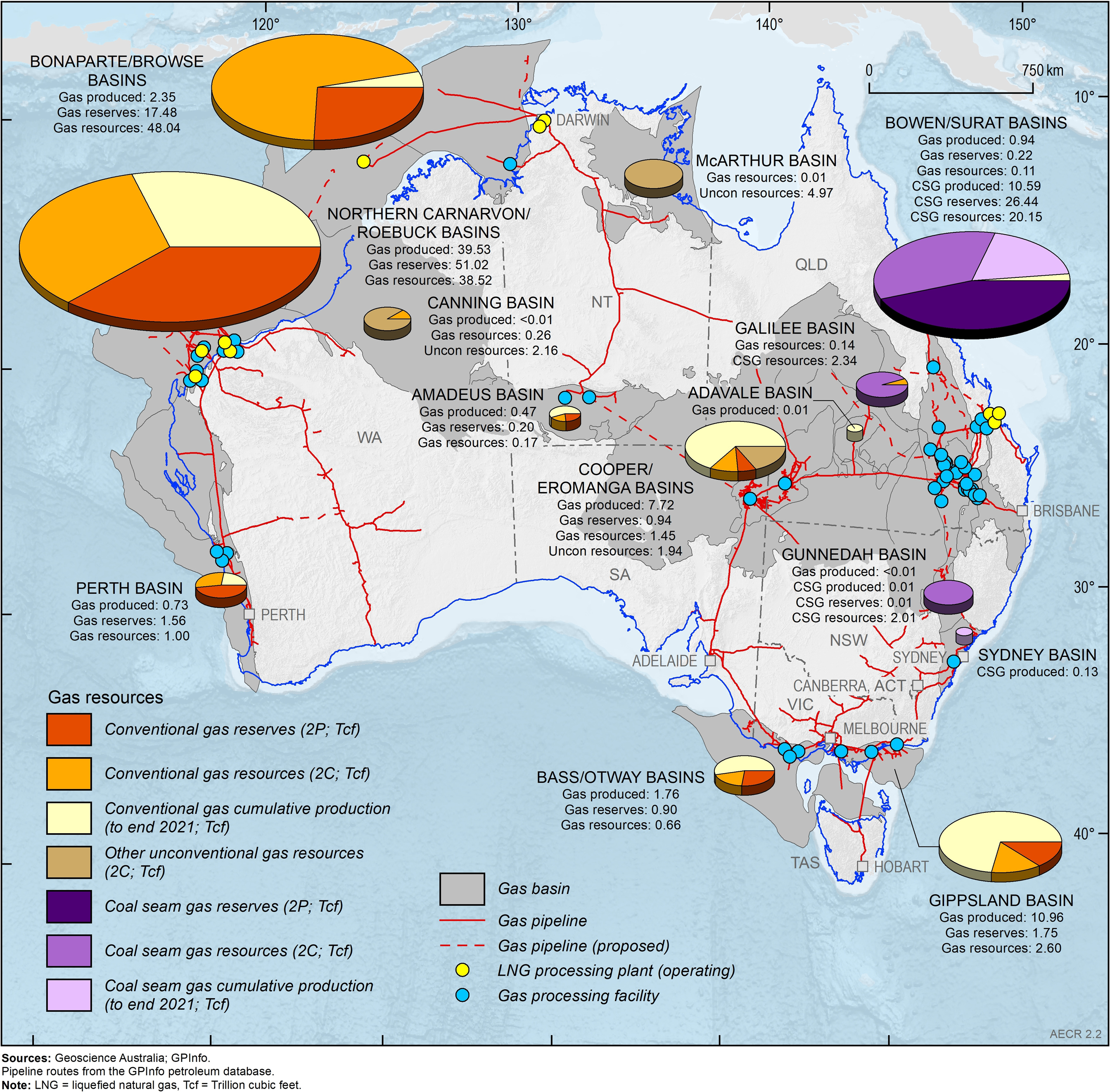Australia has substantial gas resources (Figure 1 and Figure 2). In this report, ‘gas resources’ refers to conventional and unconventional gas resources, including coal seam gas (CSG), shale gas, tight gas, basin centred gas and in-situ gasification products.