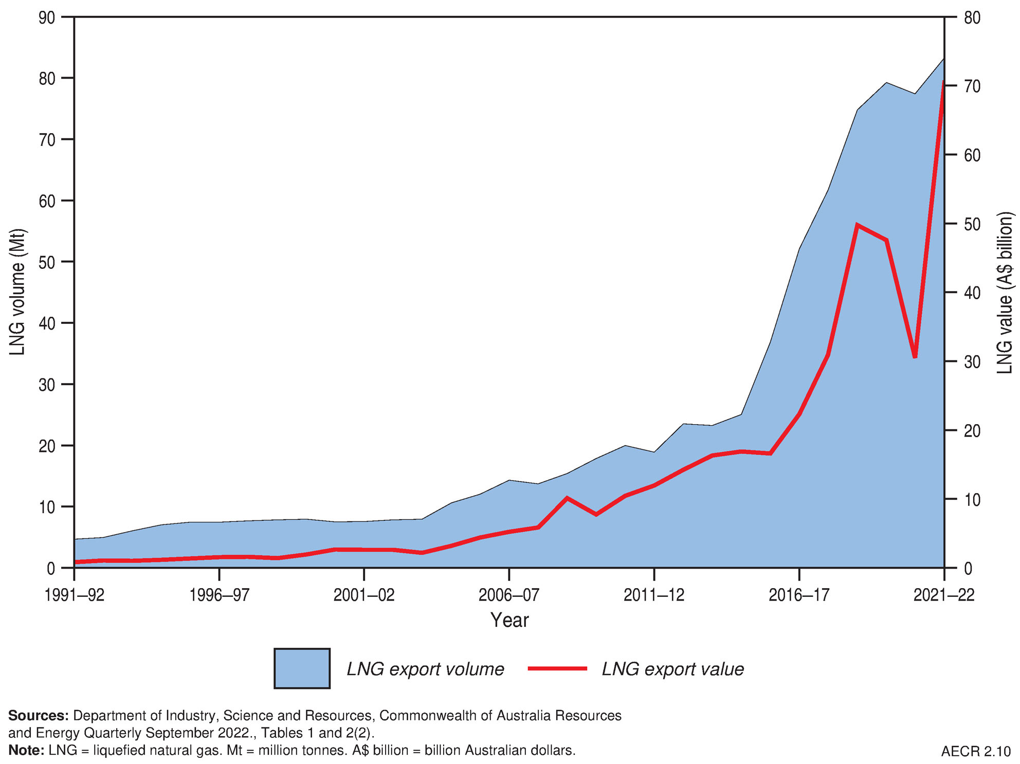 During 2021 Australia’s increase in LNG exports was the seventh highest in the world, after Egypt, the United States, United Arab Emirates, Algeria, Oman and Malaysia (bp, 2022). In 2021–22 Australia’s LNG exports reached a record high of 4,528 PJ (83.2 Mt), maintaining our status as the world’s largest LNG exporter. The high LNG prices incentivised many LNG facilities to operate at or above nameplate capacity (Department of Industry, Science and Resources, 2022). In 2022, Australia’s LNG export earnings reached $90 billion, up 82 per cent from 2021. (Department of Industry, Science and Resources, 2023).
