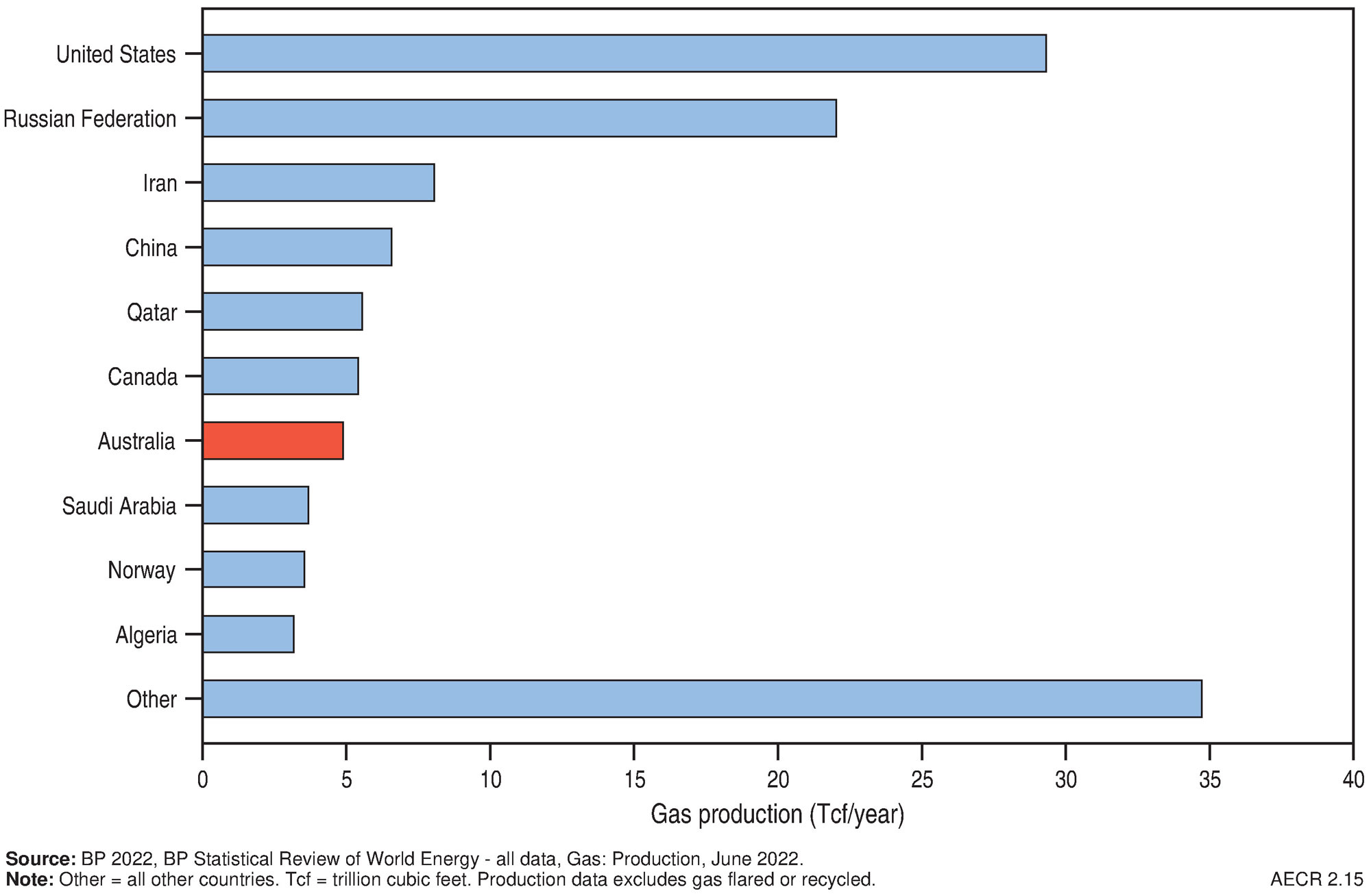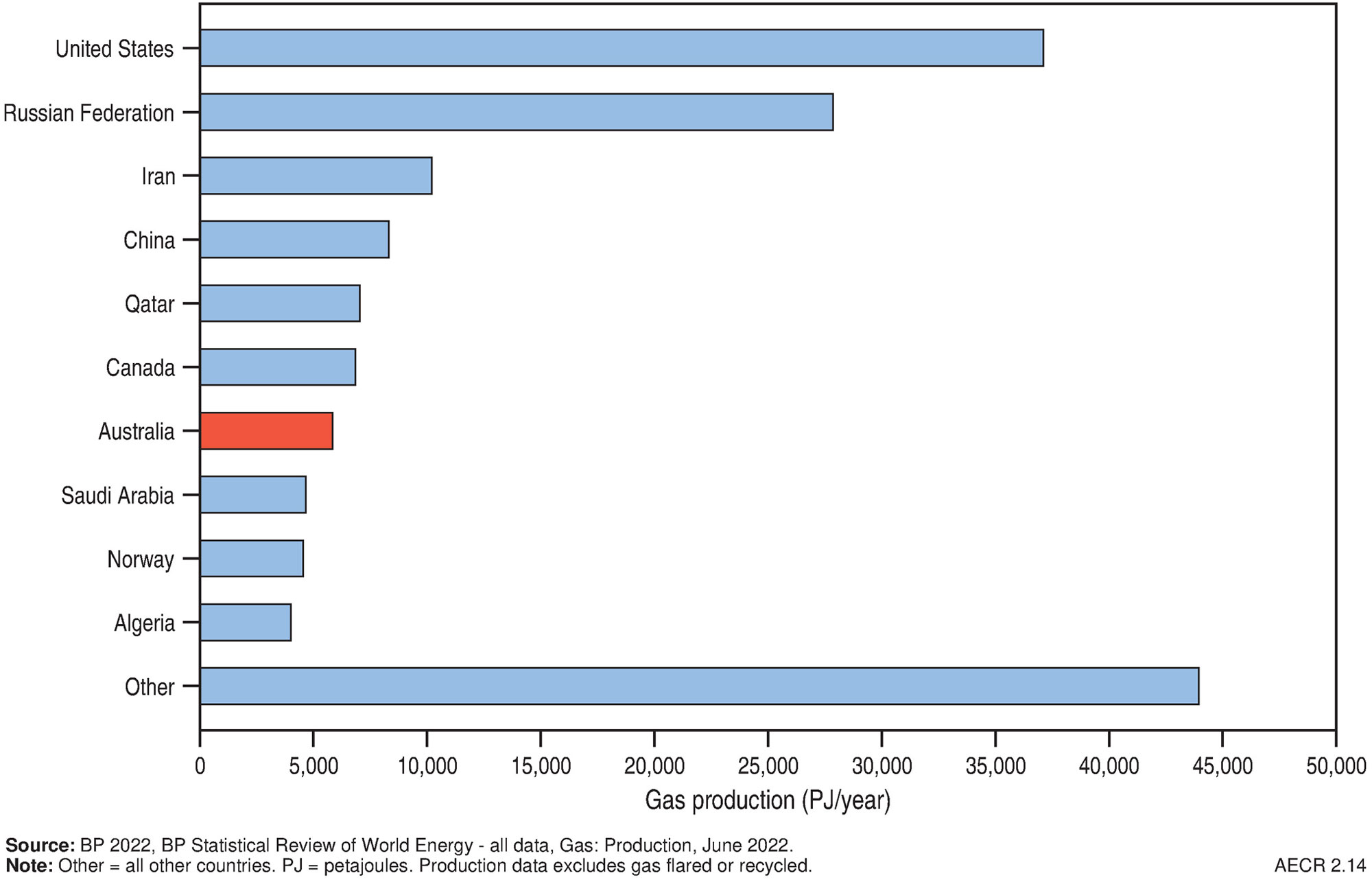 In 2021, world gas production increased by 4.8 per cent to a total of 145,328 PJ (143 Tcf; bp, 2022). Approximately 41 per cent of production came from the US and Russia (Figure 9 and Figure 10). Australia ranked seventh in the world, accounting for 3.6 per cent of total gas production during this period (Table 5).