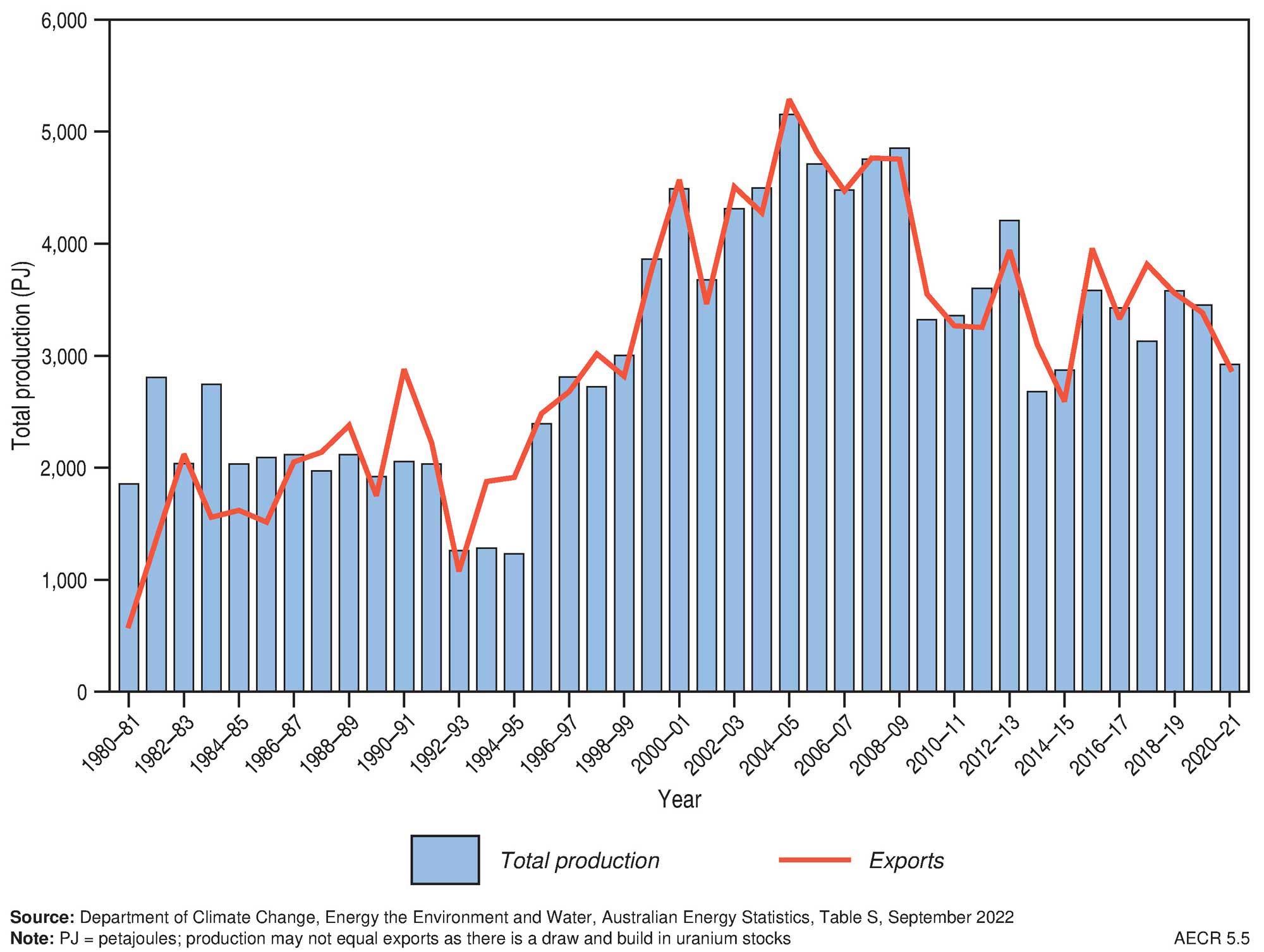 Notes: t = tonne; PJ = petajoule; RAR = Reasonably Assured Resources; CAGR = compound annual growth rate; na = not available or not applicable. Data Sources: Resources data (2022 from OZMIN; World resources and production data (2020) from, Uranium 2022: Resources, Production and Demand (in prep); Export data from, Department of Industry, Science and Resources, Commonwealth of Australia Resources and Energy Quarterly March 2023, and have been converted from tonnes uranium oxide to tonnes uranium metal; Australia production world share and ranking sourced from the World Nuclear Association web site.