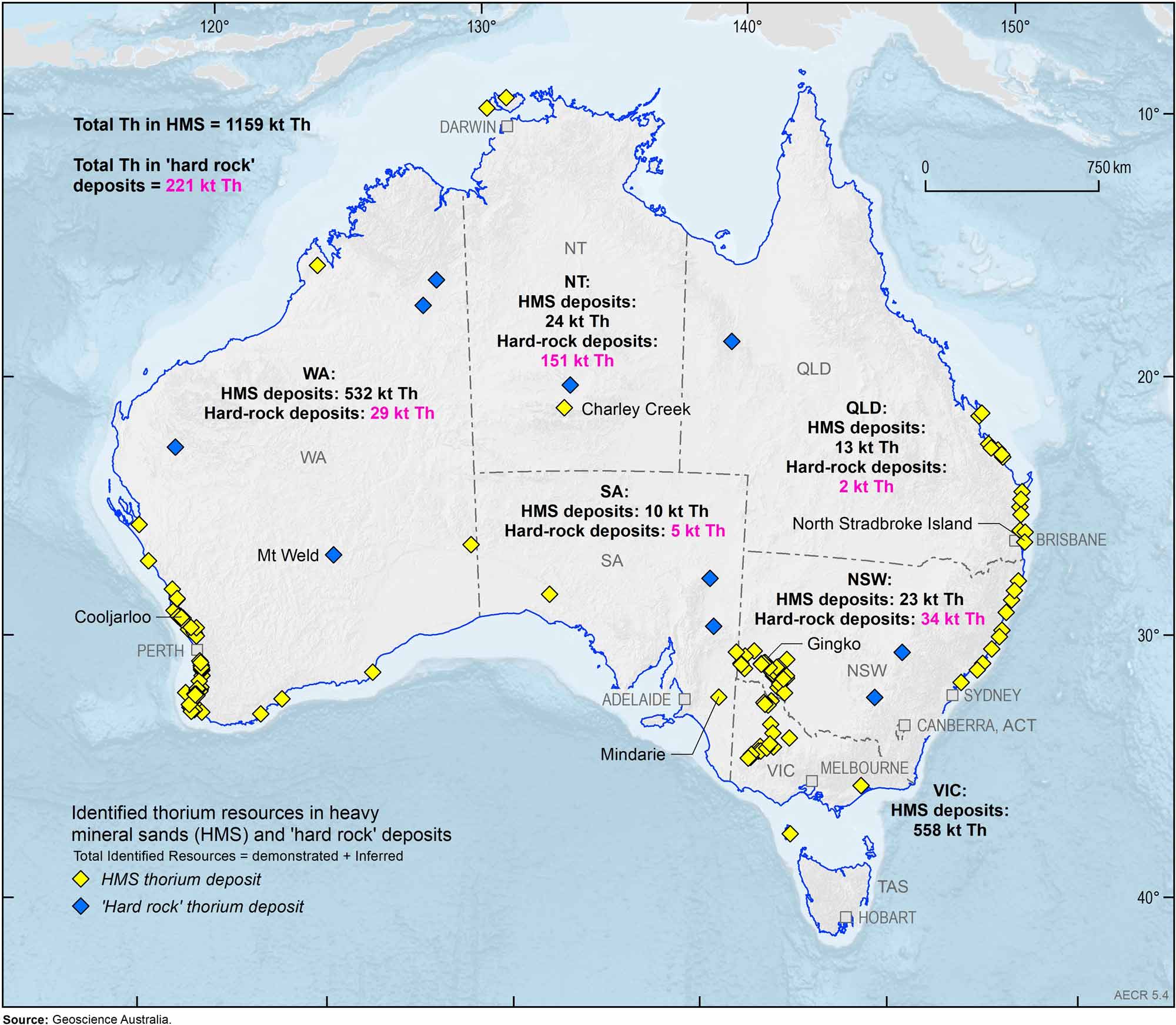 In Australia, approximately 80 per cent of thorium resources are contained in HMS deposits; the remaining 20 per cent are in rare earth element hard-rock deposits (Figure 4). Monazite and thorium resources are not generally published and so Geoscience Australia estimates the monazite (and hence thorium) content in deposits and classifies these estimated resources as Inferred Resources. Using this approach, Geoscience Australia estimates that Australia’s total identified in situ thorium resources were approximately 1,380 kt as of 31 December 2021.