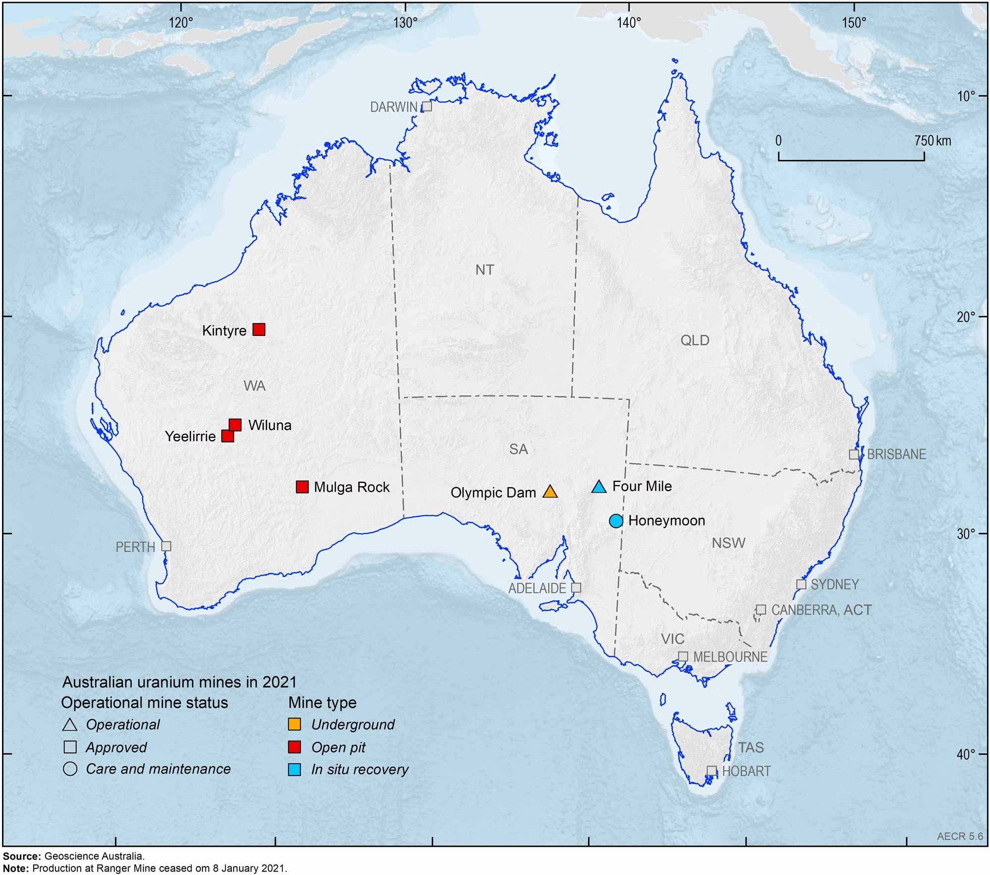 In 2021, Australia’s production of uranium was 3,798 tU (2,127 PJ; Figure 5), a drop of approximately 40 per cent compared with 2020. The fall in production was the result of the conclusion of operations at the Ranger mine as well as processing infrastructure upgrades at Olympic Dam. Nevertheless, in 2021 Australia and was the world’s 4th largest uranium producer (8 per cent) behind Kazakhstan (1st), Namibia (2nd) and Canada (3rd). This is in contrast to the previous 10 years where Australia’s uranium production has typically ranked 3rd behind Canada. In 2021, Australia’s uranium was produced from two operating mines: Olympic Dam and Four Mile, both in South Australia (Figure 6). Australia's uranium production will fall by approximately 20 per cent in the medium term due to the cessation of production at the Ranger mine in January 2021. All of Australia’s domestic production is exported.