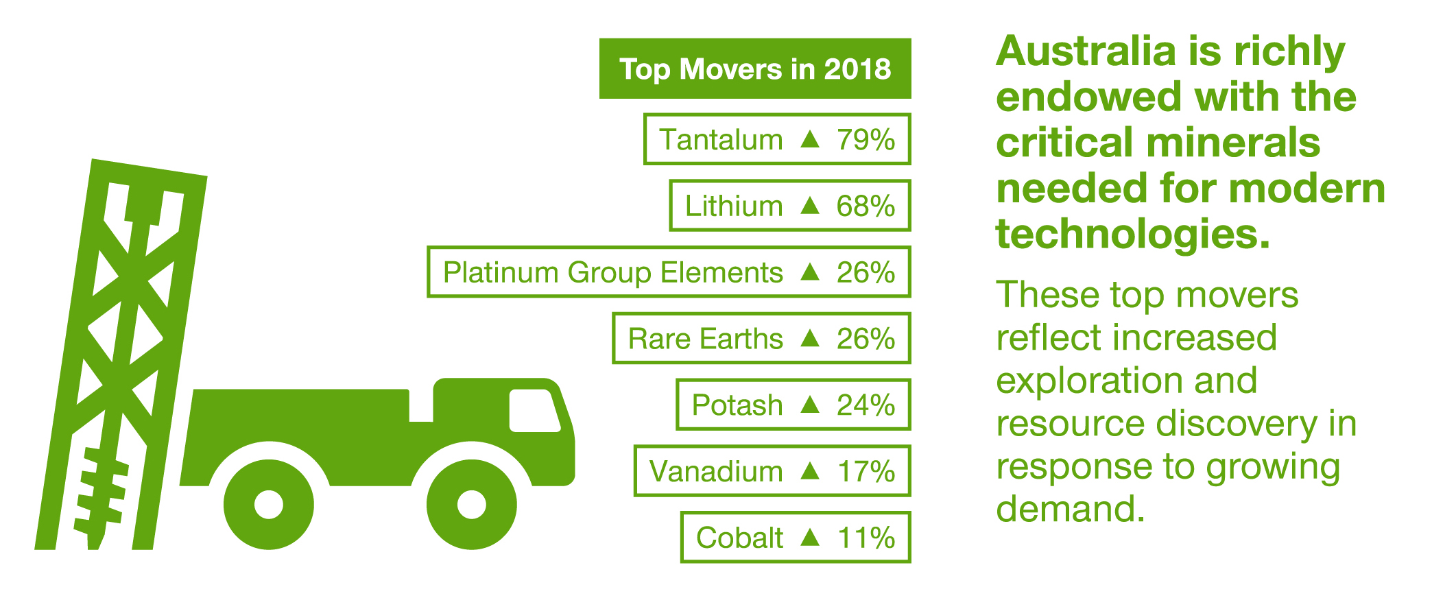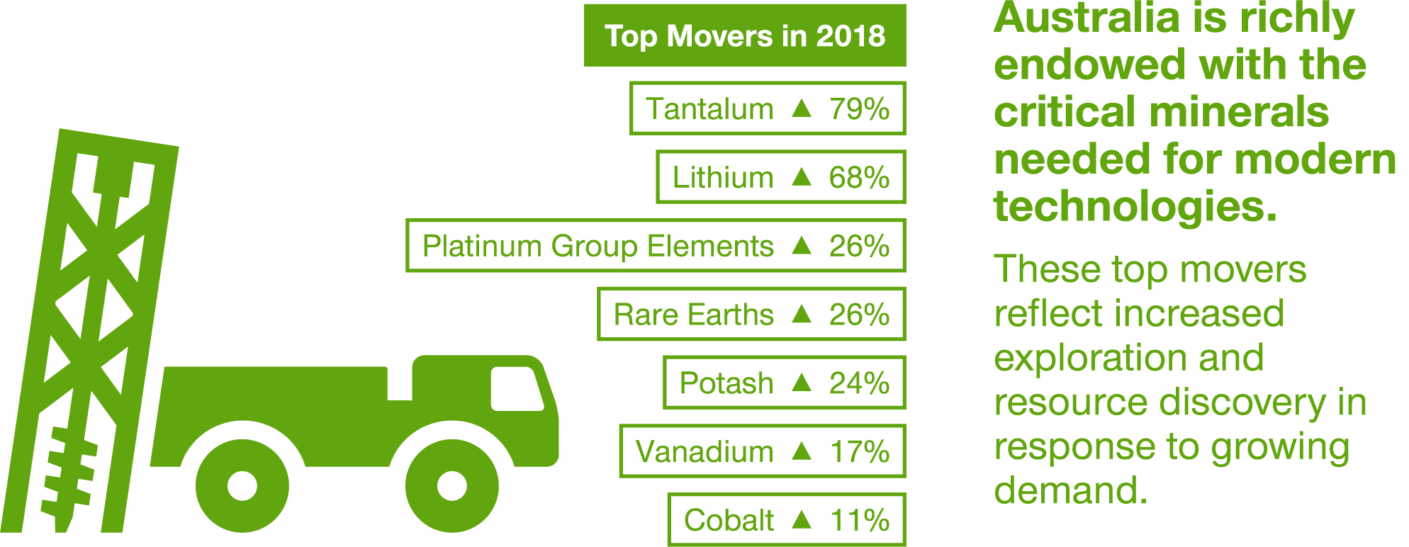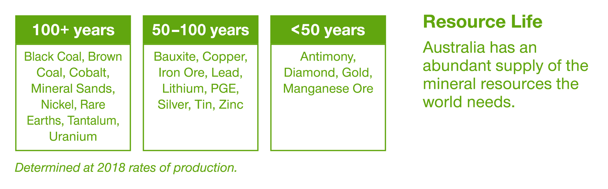 Notes: Economic Demonstrated Resources and production rankings as at 31 December 2018. Changes are from 31 December 2017 to 31 December 2018. Resource life for each mineral commodity is calculated by dividing the inventory (EDR) by production. The resulting ratio is a snapshot in time that can only be used for general impressions because it is an average and it assumes (1) that production rates in the future will remain the same as those used in the calculation, (2) deposits deemed economic/uneconomic remain so in the future and (3) that depleted resources are never replaced.