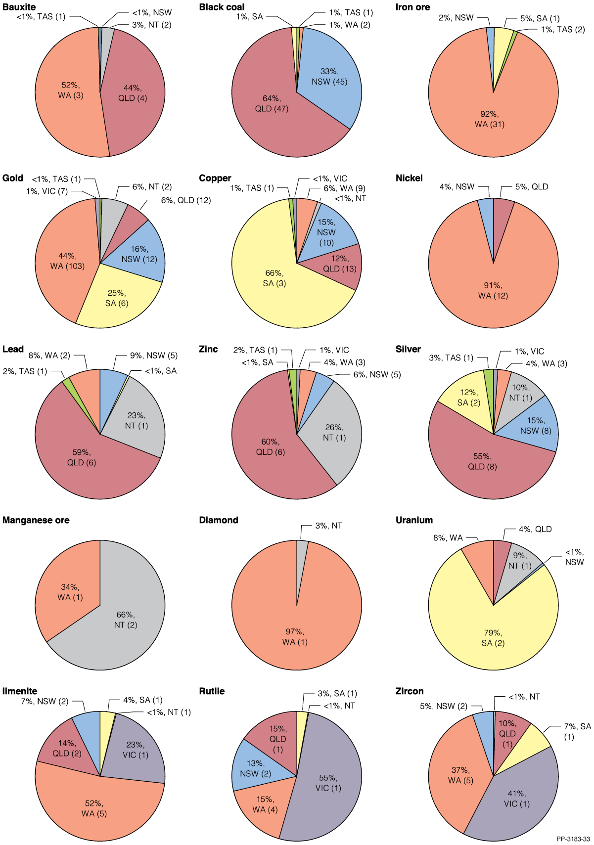 Most bauxite EDR are attributable to Queensland and Western Australia (Figure 2) where the giant deposits in Cape York and the Darling Range respectively dominate. Similarly, Australia’s enormous iron ore EDR are geographically concentrated in the Pilbara region of Western Australia. Western Australia also holds almost all of nickel and diamond EDR, though the latter has fallen dramatically in 2018 with the closure of the Argyle mine (Table 4). Manganese ore EDR are found in Western Australia and the Northern Territory. On the other side of the country, almost all black coal EDR are located in Queensland and New South Wales (Figure 2). Silver, lead, zinc, copper, uranium and mineral sands are more dispersed across the country (Figure 2), but the top ten deposits for each of these minerals dominate EDR (68–93%; Table 7).
