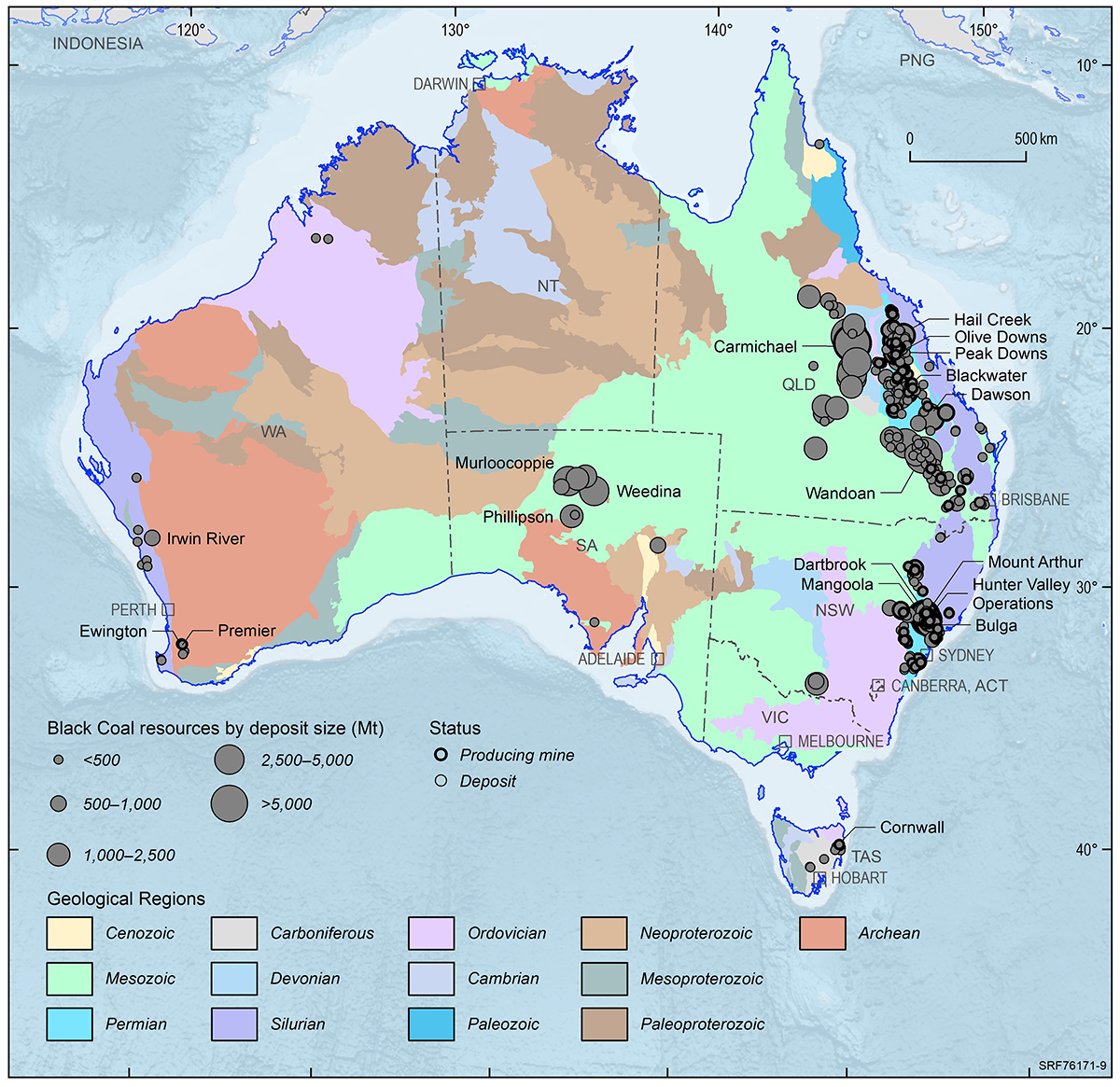 Resource figures are as at 31 December 2021. Operating mines and production are for calendar year 2021. Percentage increases or decreases are in relation to 2020. World rankings are followed by percentage share in brackets. Export income is the sum of thermal and coking coal categories, sourced from Office of the Chief Economist, Resources and Energy Quarterly, December 2022.
