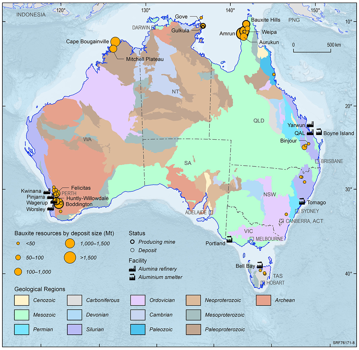 Resource figures are as at 31 December 2021. Operating mines and production are for calendar year 2021. Percentage increases or decreases are in relation to 2020. World rankings are followed by percentage share in brackets. Export income is the sum of bauxite, alumina and aluminum categories, sourced from Office of the Chief Economist, Resources and Energy Quarterly, December 2022.