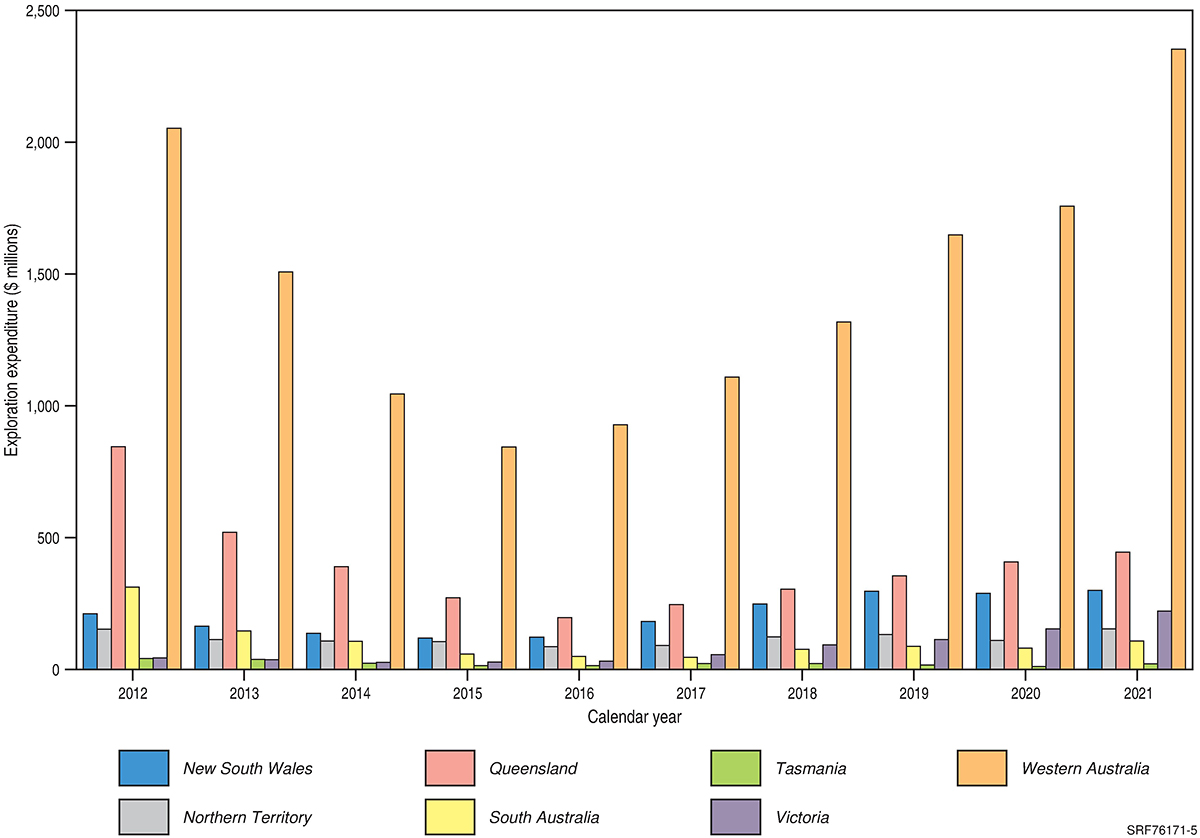 In 2021, exploration expenditure was at the highest levels ever recorded in both Western Australia (up 34% to $2,351 million) and Victoria (up 43% to $219 million; Figure 5). Western Australia accounted for 65% of national exploration expenditure in 2021, followed by Queensland with 12% ($445 million). In fact, most Australian jurisdictions saw an increase in exploration as COVID-19 restrictions eased during 2021. Tasmania was particularly noteworthy with its exploration expenditure almost doubling, up 94% to $21 million.