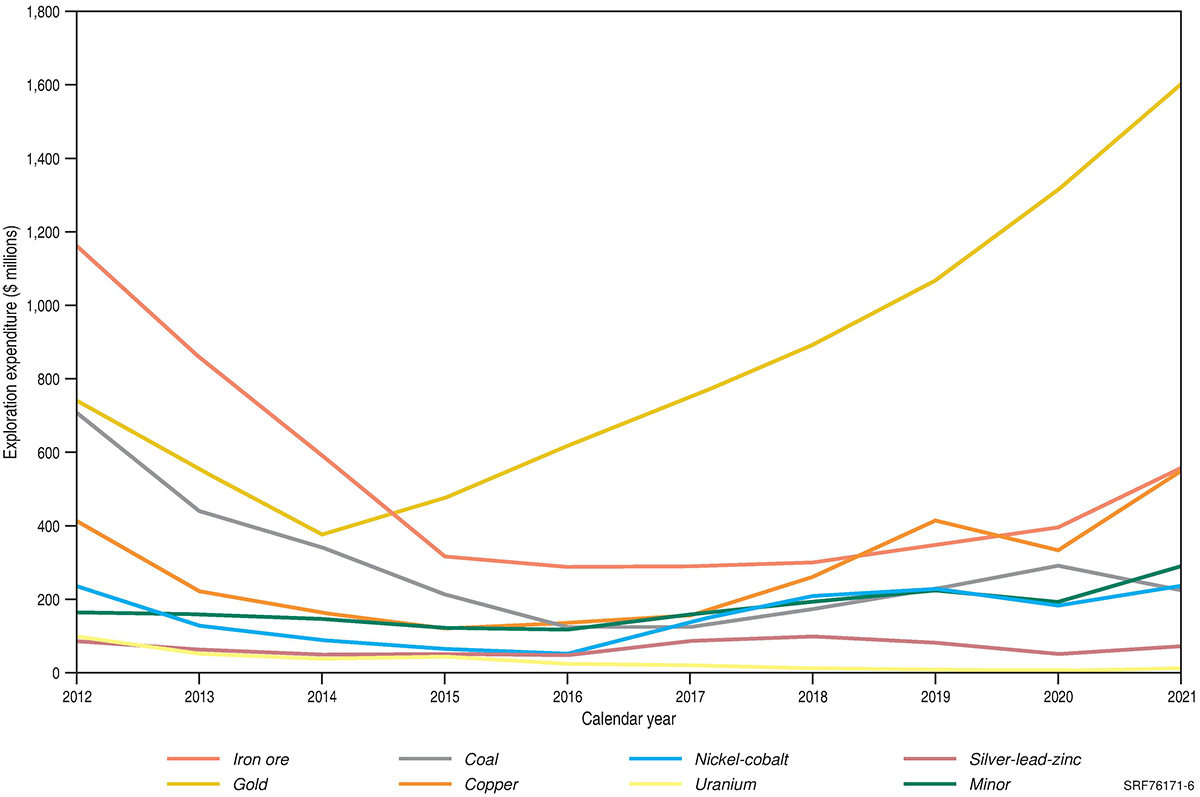 Mineral exploration expenditure in 2021 was impacted by various federal and state health controls implemented to limit the COVID-19 pandemic. Despite this, overall exploration expenditure remained strong in Australia, buoyed in particular by high gold and iron ore prices. Quarterly reports on mineral exploration data published by the Australian Bureau of Statistics12 show that total mineral exploration expenditure for the 2021 calendar year was up 28% to $3,596 million compared to the 2020 calendar year ($2,809 million; Figure 3).