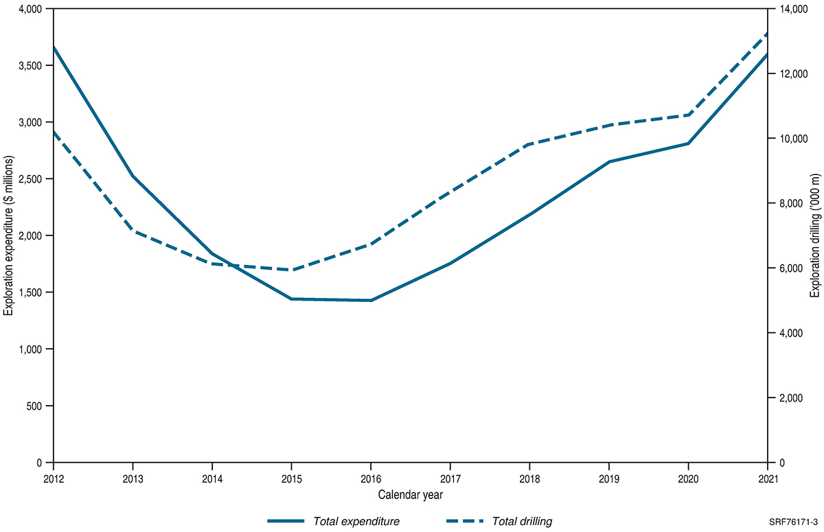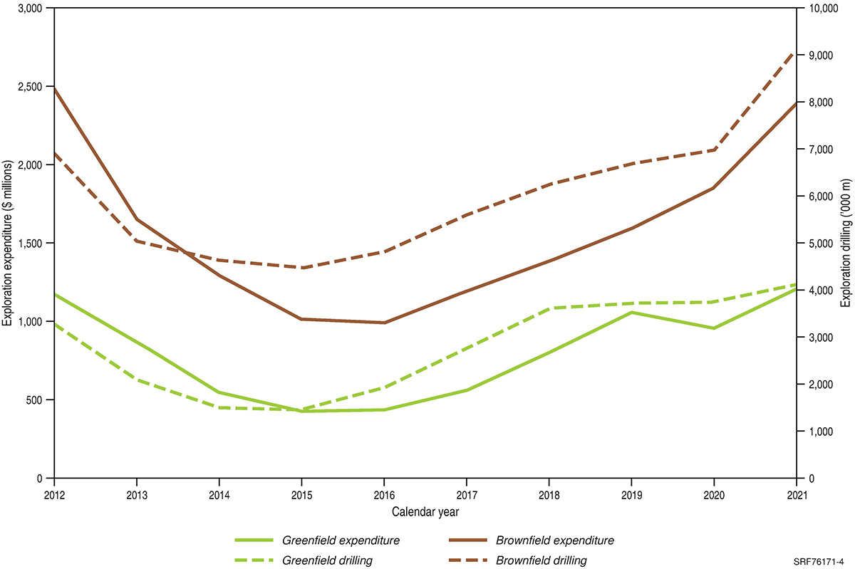 In the search for new mineral deposits, exploration expenditure and drilling in greenfield tenements was up 26% from $957 million in 2020 to $1,208 million in 2021, and metres drilled up 10% from 3,736,500 m in 2020 to 4,120,500 m in 2021. Likewise, exploration expenditure and drilling around existing deposits (brownfield) was up 29% to $2,388 million in 2021 compared to $1,852 million in 2020, and metres were up 30% to 9,090,100 m from 6,996,500 m in 2020 (Figure 4).