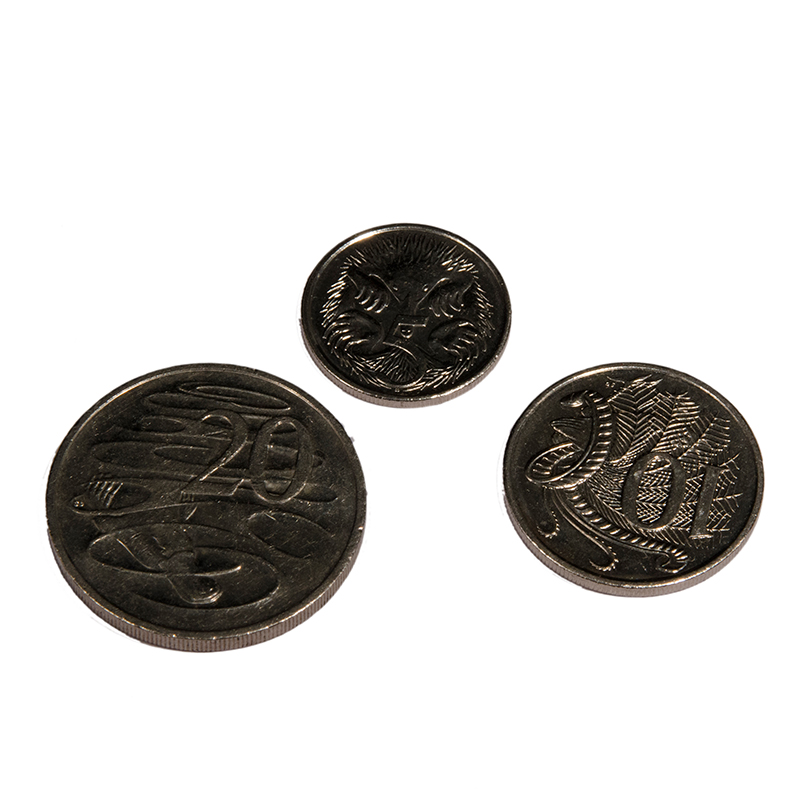 | Coins | Nickel was first used for coinage in Belgium in 1860, and has been widely used since then. Australian $1 and $2 coins contain 2% nickel (with 92% copper and 6% aluminium), and our 5c, 10c, 20c and 50c coins contain 25% nickel (with 75% copper). The Australian 20 cent coin is more silver-white in colour than a $1 coin due to the relative amounts of nickel. |