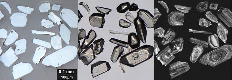 Zircons can survive processes like erosion, transport and metamorphism, so they preserve a record of past geological processes. They are one of the key minerals used by geologists to determine the age of rocks. Zircons contain trace amounts of uranium and thorium, which decay radioactively over time. Because the rate of radioactive decay is known, scientists can measure the tiny amounts of these elements in a zircon to work out how old a host rock is. Zircons extracted from rocks from Jack Hills in Western Australia are up to 4.4 billion years old.