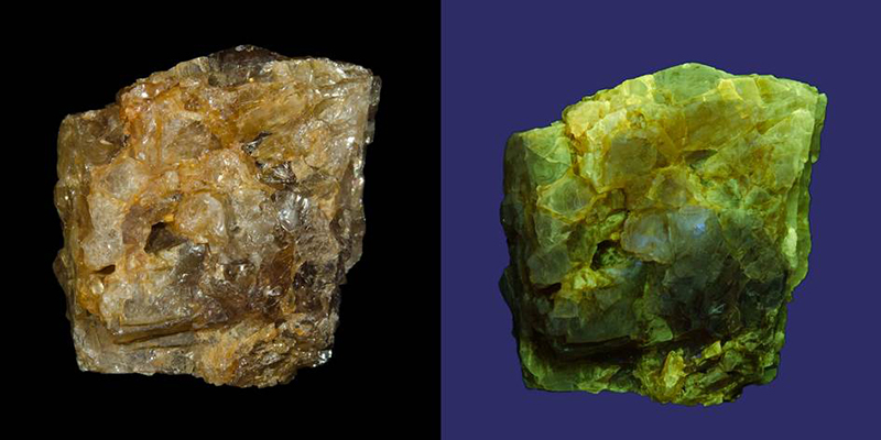 Zircon is usually reddish brown, but can be white, orange, yellow, yellowish brown, purplish red, light red, blue, green and sometimes colourless. It is usually translucent but can be transparent. In fluorescent light zircons appear yellow (see Google Arts and Culture: Fluorescent Minerals: Rocks that get excited under ultraviolet light). Their average size in granite is 0.1 to 0.3 mm, but they can grow larger in pegmatites and carbonatites. A crystal