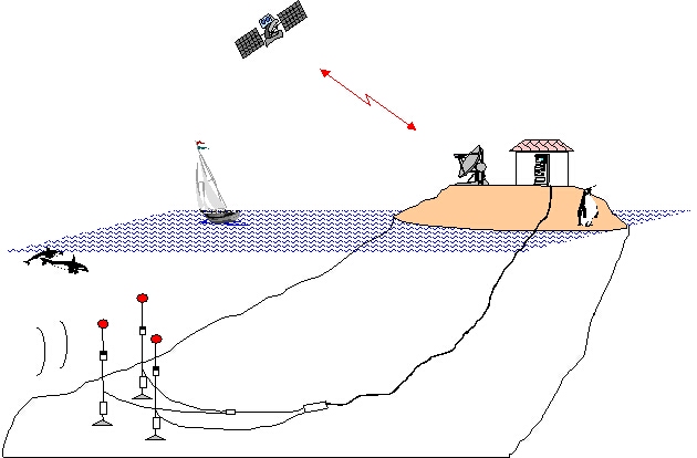 - a central shore facility, which houses both electronic and electrical equipment to power the hydrophone array, record the data, reformat and transmit the data via satellite link to the IDC in Vienna. Commonly the data is also provided to the station operator on a separate communications link.