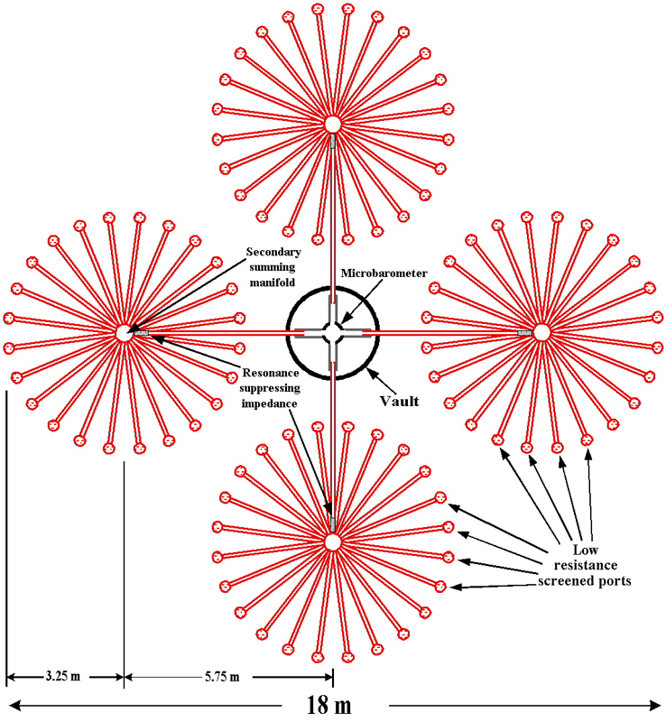 An infrasound station consists of a number of very sensitive microbarometers. To increase the sensitivity of the station each microbarometer is connected to several radiating pipes with each pipe having small holes (ports) along its length. This arrangement of pipes and inlet ports, commonly called a space filter, averages and largely cancels out pressure variations localised over an area smaller than the filter - such as wind generated turbulence. The maximum dimension of the space filter is limited by the frequency range of the signals of interest and the speed of sound in air. For a normal IMS station the space filter will be limited to a maximum diameter of about 18 metres. If the diameter is larger than this the higher frequency signals of interest would start to cancel out because there will be a significant portion of a signal wavelength being sampled by the space filter at any one instant.