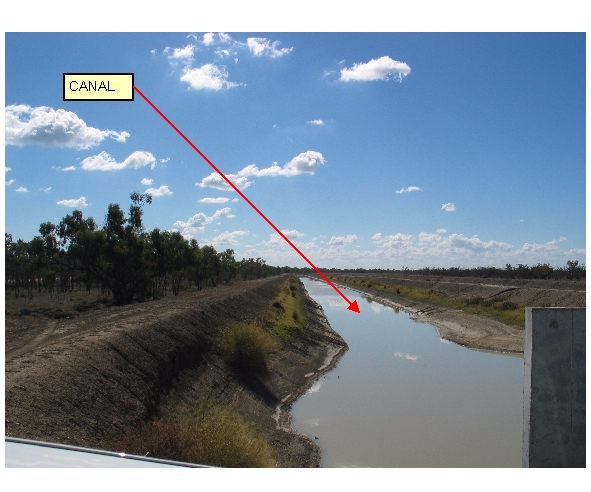 - This is an example of a large Canal partially filled with water used for the purpose of Flood Irrigation in regional New South Wales. Note the width, depth and length of this Canal.