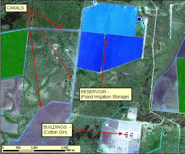 - Large Flood Irrigation Reservoirs can be identified by related infrastructure, such as Cotton Gin facilities that require Flood Irrigation practices.