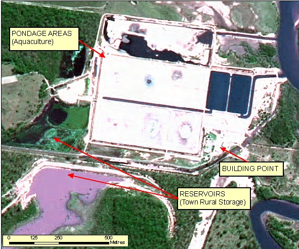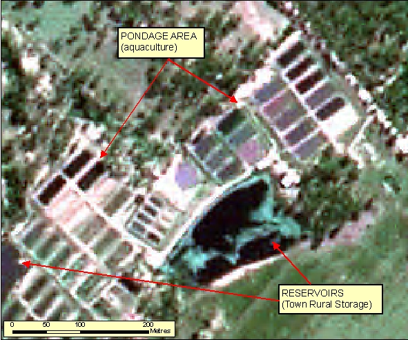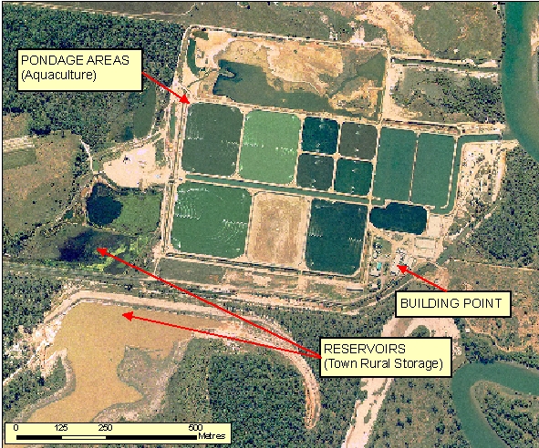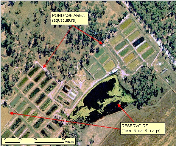- Aquaculture Areas can be differentiated from Settling Ponds due to their proximity to other features such as town rural water supply, whereas Settling Ponds are rarely found near Town Rural Storage Reservoirs.