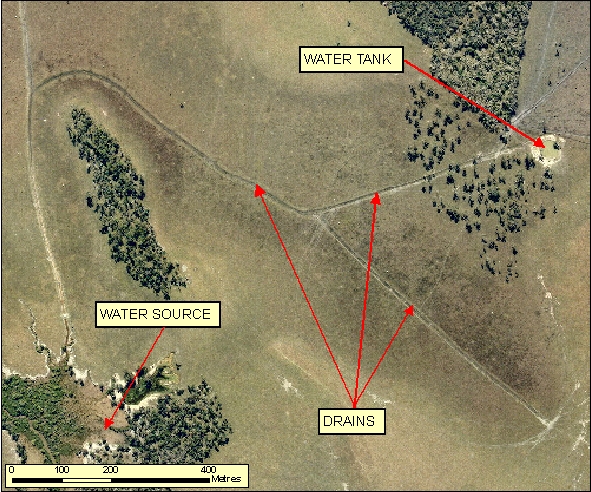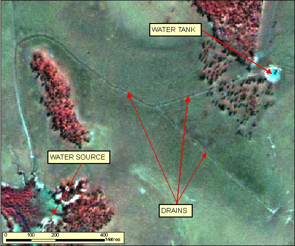 - In Figure: 2.3.2.2b note that the upper part of the drain near the water source gives off a light blue signature, indicating presence of water. The drain terminates at the water tank which also shows the same water signature.