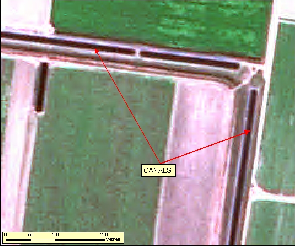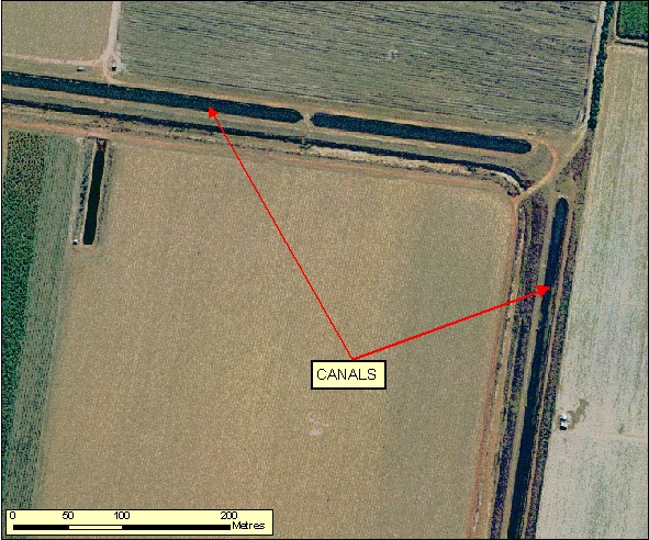 - In areas where there is irrigated crop farming Canals/Drains appear as regular structured networks which show a water flow hierarchy diminishing from source. They are often aligned with paddocks and have access tracks or roads running parallel to them.
