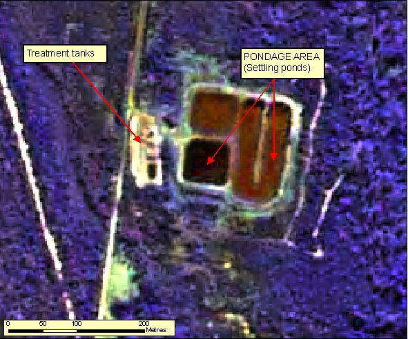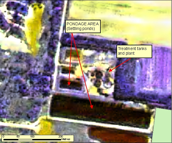 - Settling Ponds appear on imagery as large geometric shaped ponds separated by levees.