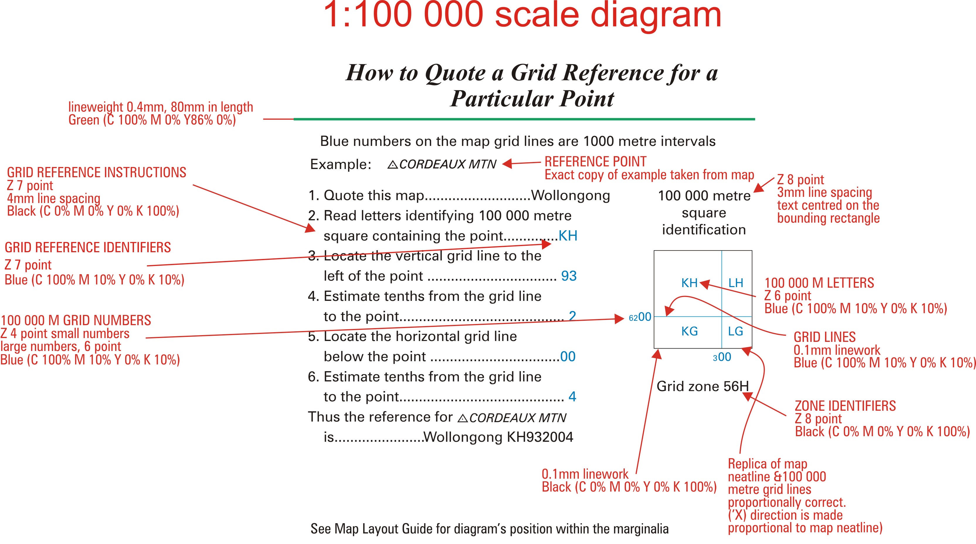 The following information relates to the Layout Guides provided for the 1:250 000 and 1:100 000 mapping guides. The guides should be used in conjunction with the specified sheet sizes, (see Appendix H). The guides are supplemented by the following detailed specifications of the Marginalia and map elements.