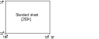 Standard sheet area: the standard sheet areas are 1o in latitude by 1o 30' in longitude for 1:250 000 and 30' in latitude by 30' in longitude for 1:100 000.