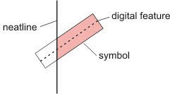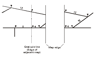The symbology for linear features will not extend beyond the map neatline. Symbology for features that meet the neatline will be truncated at right angles to the feature within the neatline. Treatment of the symbology for linear features meeting the tile edge is shown below.
