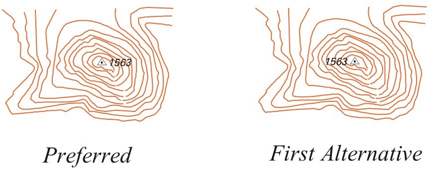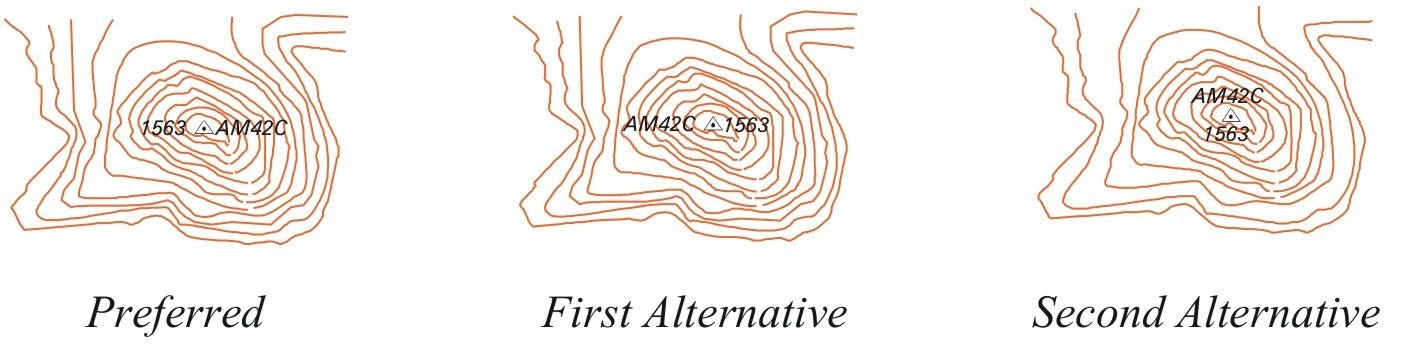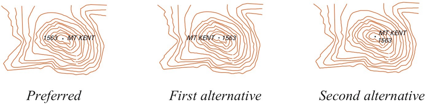When, for the sake of clarity, it is necessary to displace a symbol, the amount of displacement will be kept to a minimum. In situations where it is not possible to correctly position all the symbols for a group of features, only the symbol for the most important feature will be shown.
