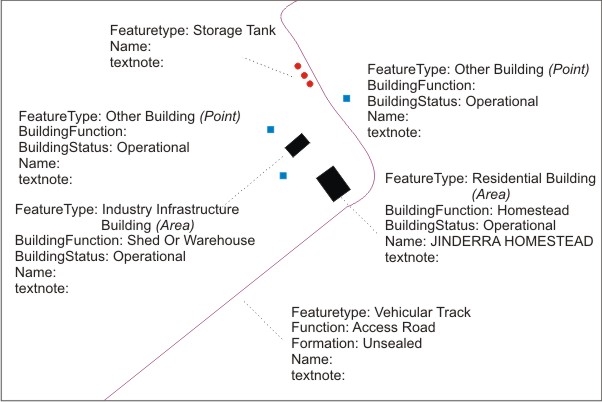 Existing Building Areas below the minimum data capture size for a Building Area will be retained in the same geometry as captured in the base material/digital data (eg Building Area or Building Point). The only exception is all features below 625 sq m which will be shown as Building Point.