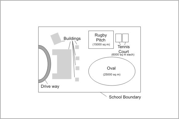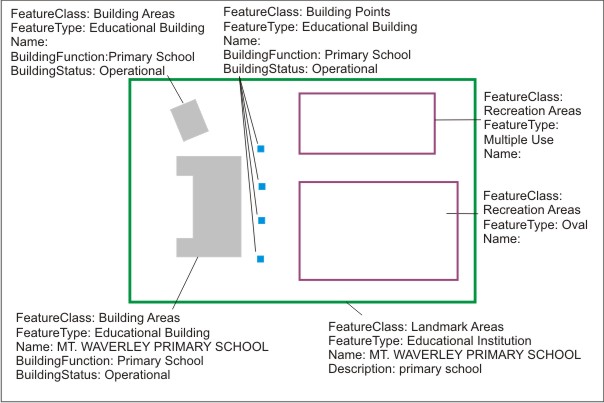 Reference and Supporting Information provided with work packages generally provide sufficient detail to capture schools accurately with assistance from imagery. Directly below is a schematic diagram of a schools and then an example highlighting how that school should be captured in the NTDB, dependant on the size criterion and other rules set out by Appendix A Feature Type Dictionary.