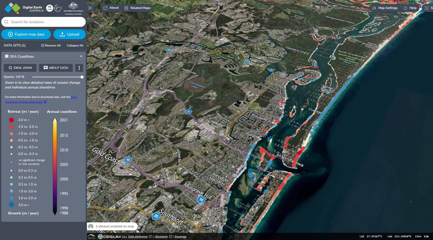 Digital Earth Australia Coastlines (DEA Coastlines) is a leading-edge coastline mapping service, developed through Geoscience Australia. It combines U.S. Geological Survey (USGS) Landsat satellite data and tidal modelling to map over 30,000 km of Australia’s dynamic coastline with annual data spanning back to 1988.