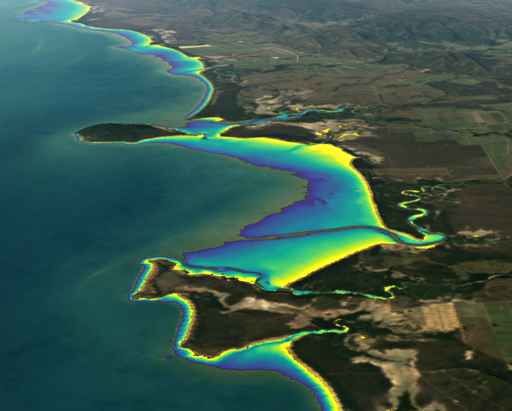 The intertidal zone is the area between the highest tide mark and the lowest. DEA Intertidal Elevation helps us to understand some of the most vulnerable ecosystems through maps in 3D that show the depth (elevation) of Australia’s beaches, tidal flats, rocky shores, and reefs. This information helps us understand how the intertidal region changes due to tide. This data, complemented by the longer-term changes identified using DEA Coastlines, can be used to provide a highly accurate picture to inform decision-making and planning. Dr Robin Beaman from James Cook University used DEA Intertidal Elevation as a key data source to develop the Great Barrier Reef, Torres Strait, and Northern Australia 30m Bathymetry grid products. These products provide a crucial link and consistent elevation data in the transition between the ocean and the land, enabling improved modelling and decision making in the coastal zone for applications such as risk assessment and habitat management.