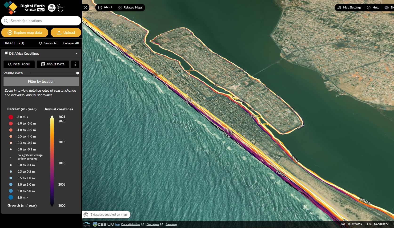 In Senegal, seaside communities are feeling the impact that climate change is having on how and where they live. In one example, the coastal town of Saint-Louis, in particular, is experiencing rapid erosion of its coastline. Coastal erosion is further compounded by high tides flooding the streets and destroying schools and homes. Flooding has forced the relocation of over 300 families from their homes to UN-funded local camps set up to help internally displaced people. Local decision-makers use DE Africa to identify patterns in changes to their coastline. This insight is used to make informed decisions for communities, such as developing long-term housing options that will withstand the changing coastline.