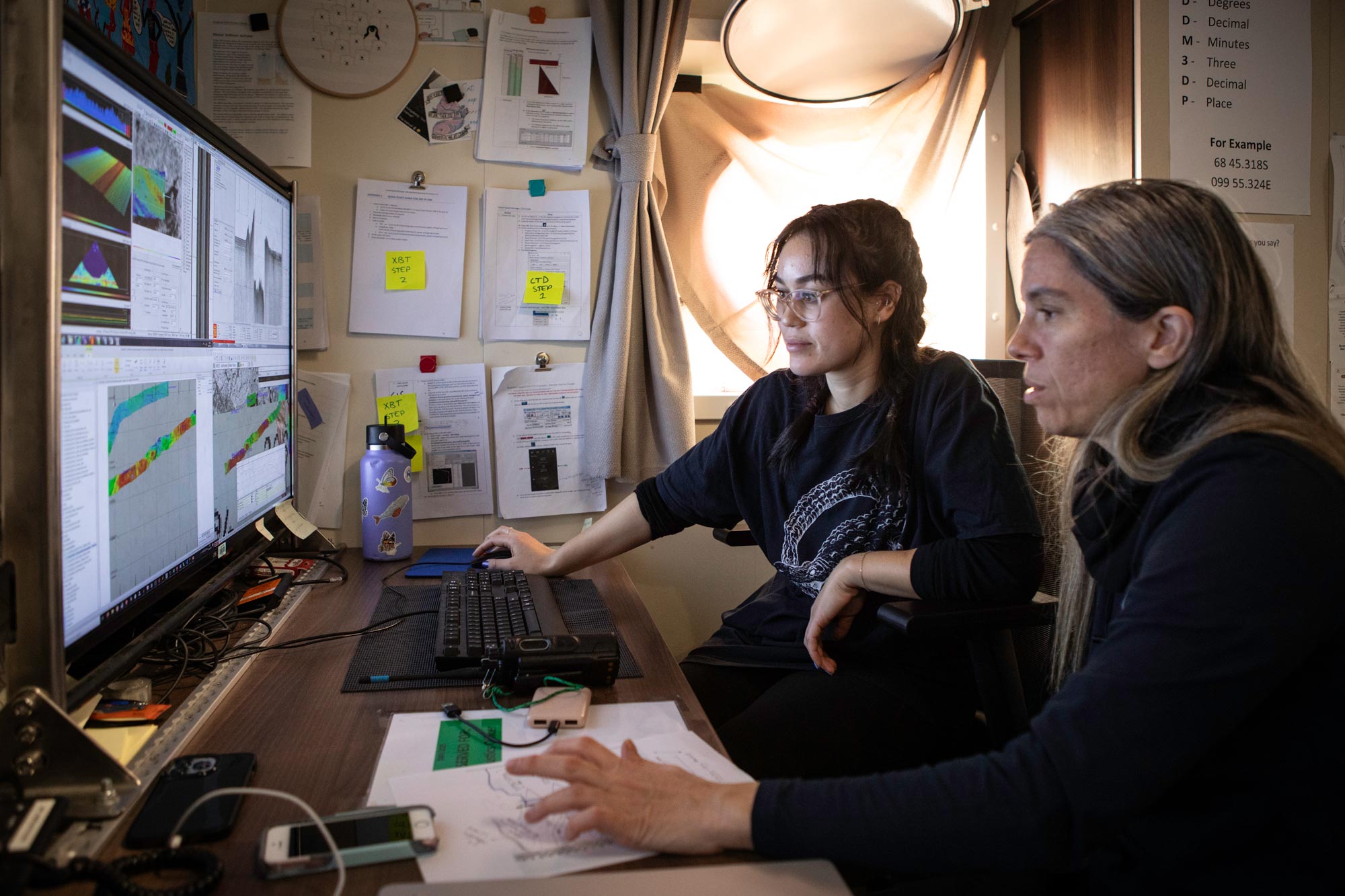 Jasmin Wells (left) with Dr Laura Herraiz Borreguero looking at bathymetry (Photo: Pete Harmsen, AAD)