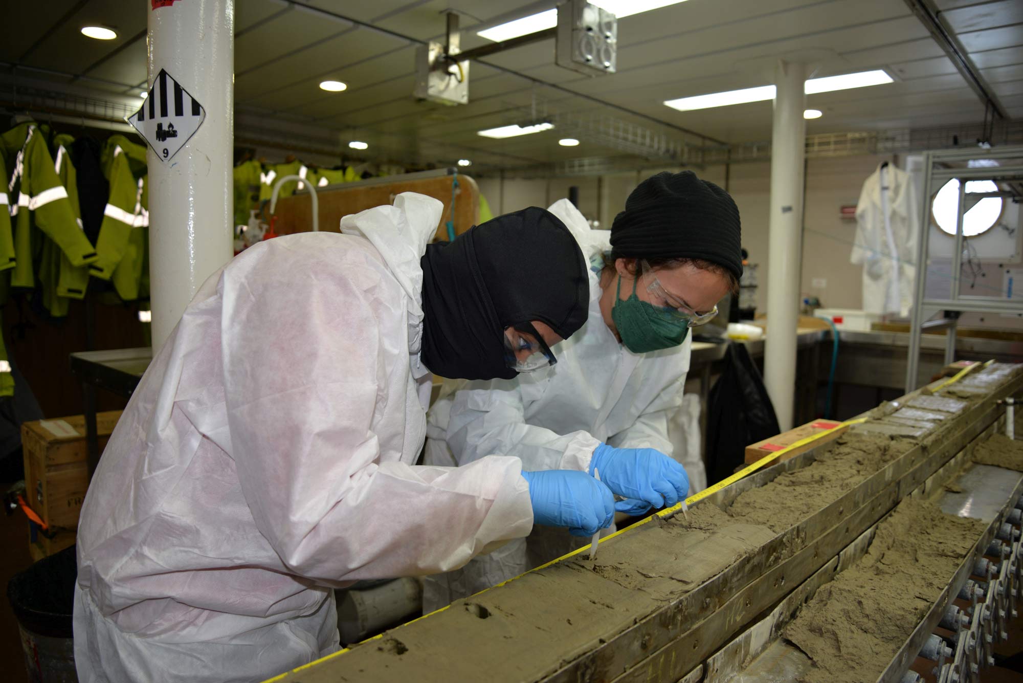 Scientists viewing the new sediment cores on board the RV Investigator. Full protective gear is worn to prevent sample contamination. Photo: Geoscience Australia – Andrew Carroll