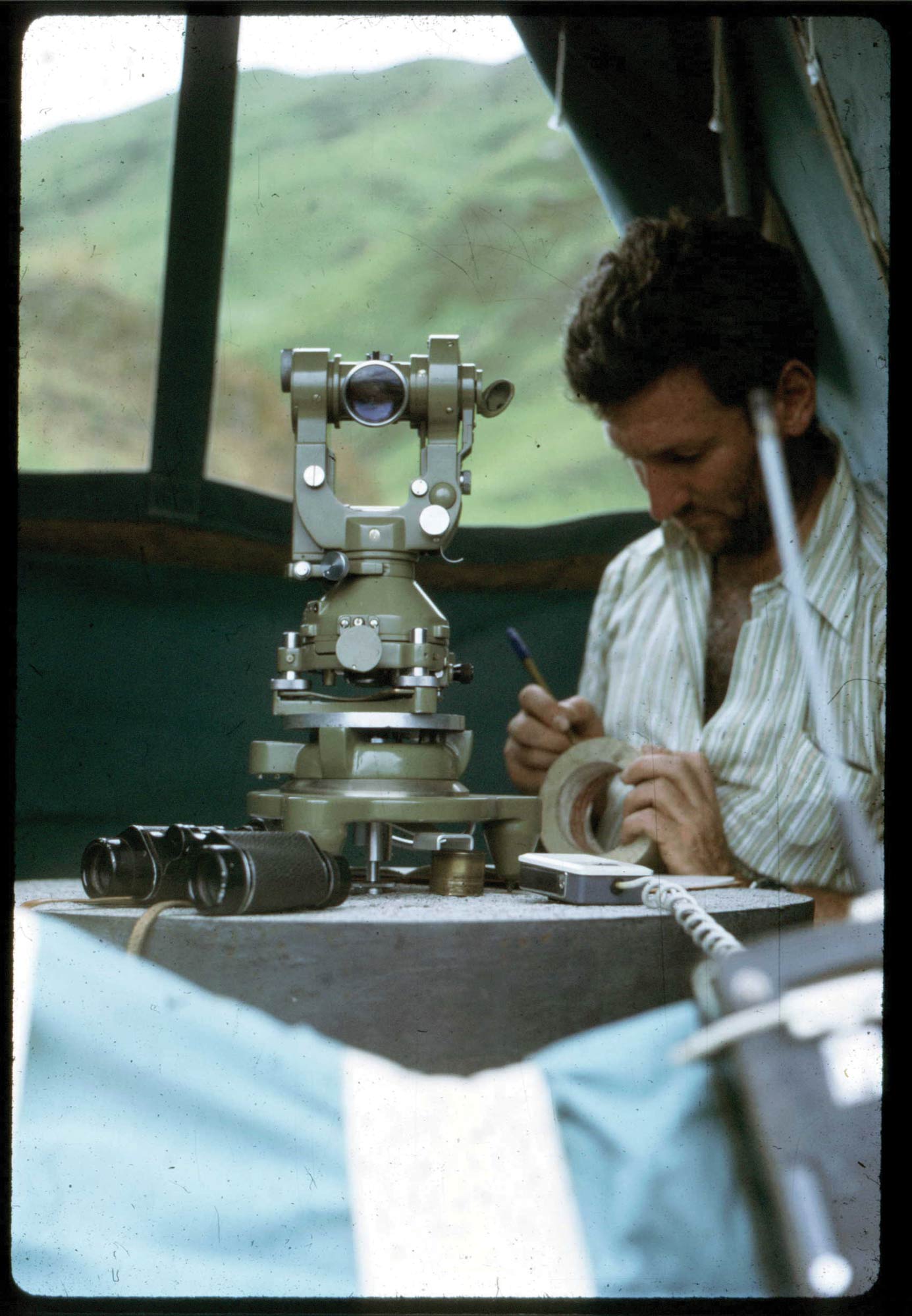 Surveyor Steve Bennett records geodetic measurements during the 1973 Crustal Movement Survey of the Ramu Markham Fault. Image: J Steed