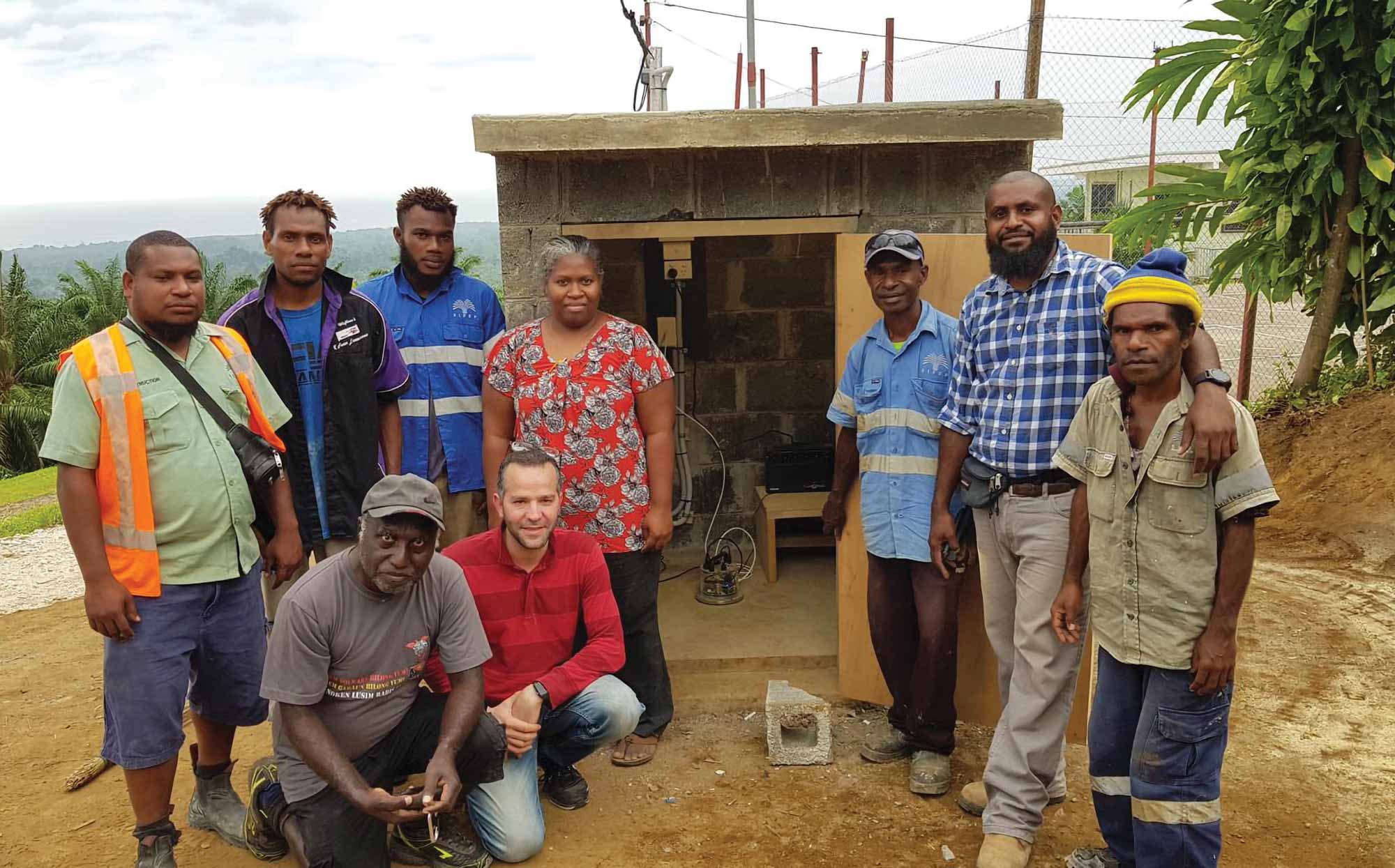 Geoscience Australian Senior Seismologist, Dr Hadi Ghasemi (centre) with Bialla International School staff after installing a seismic sensor in New Britain, Papua New Guinea in 2019. Image: Geoscience Australia