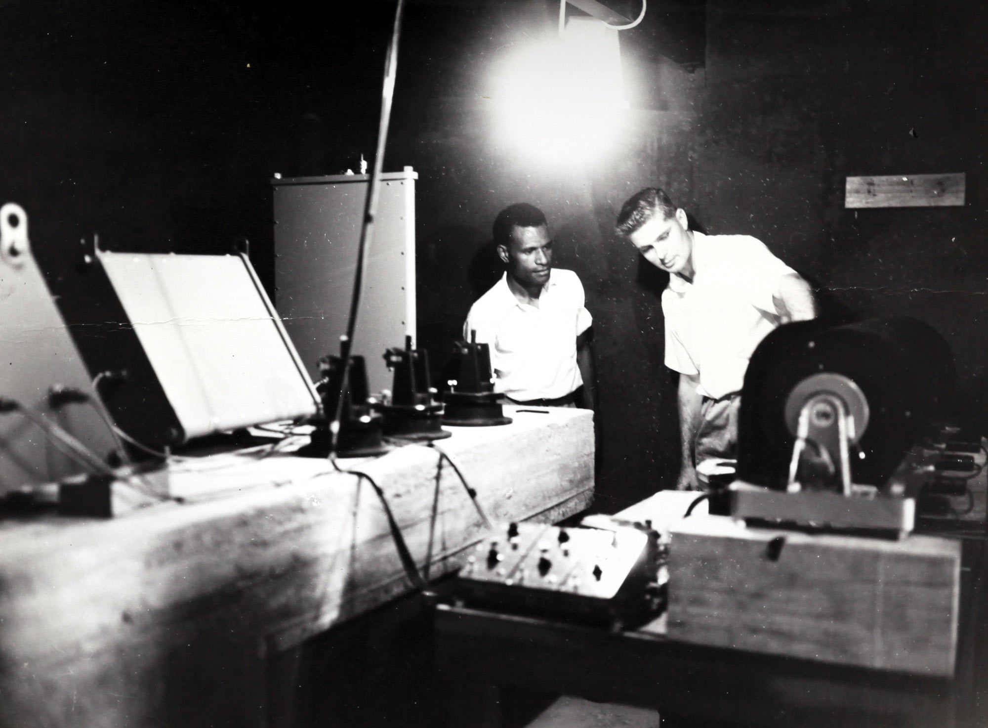 Ben Talai and Leslie Topue attend to monitoring equipment in the Rabaul Volcano Observatory recording room in the late 1960s. Image: Rabaul Volcano Observatory