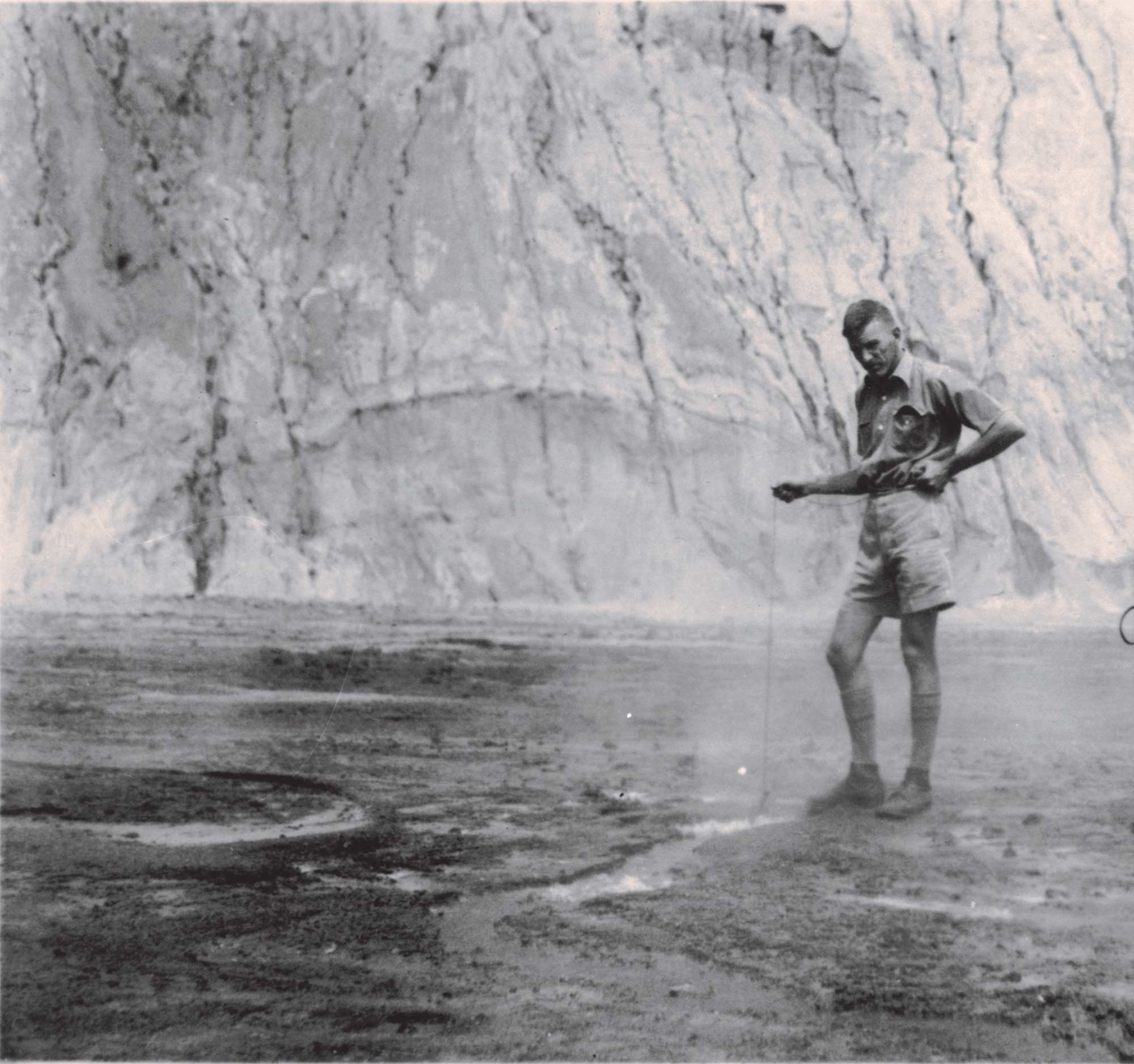 Doc Fisher can be seen here measuring the temperature of a fumarole (vent) at Rabaul in 1937. Image: Geoscience Australia