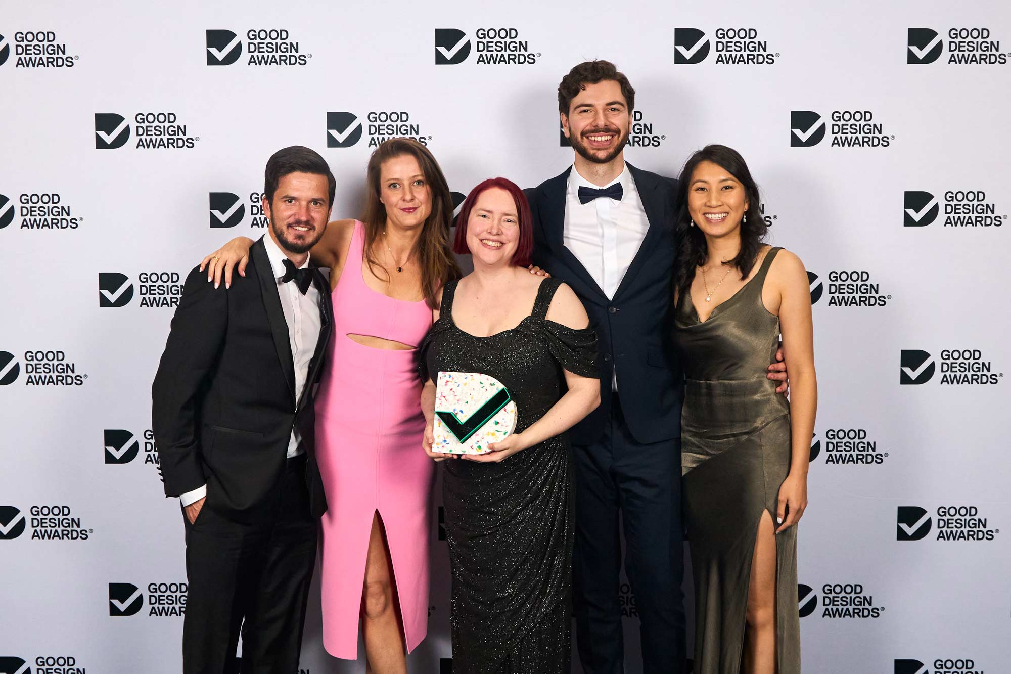 GeoInsight team, Geoscience Australia’s Dr Kathryn Waltenberg (centre) with Future Friendly collaborators (L-R) Anthony McGuinness, Laura Ryan, Oliver Bryant and Wendy San, at the 2024 Australian Good Design Award Ceremony holding a Good Design Award.