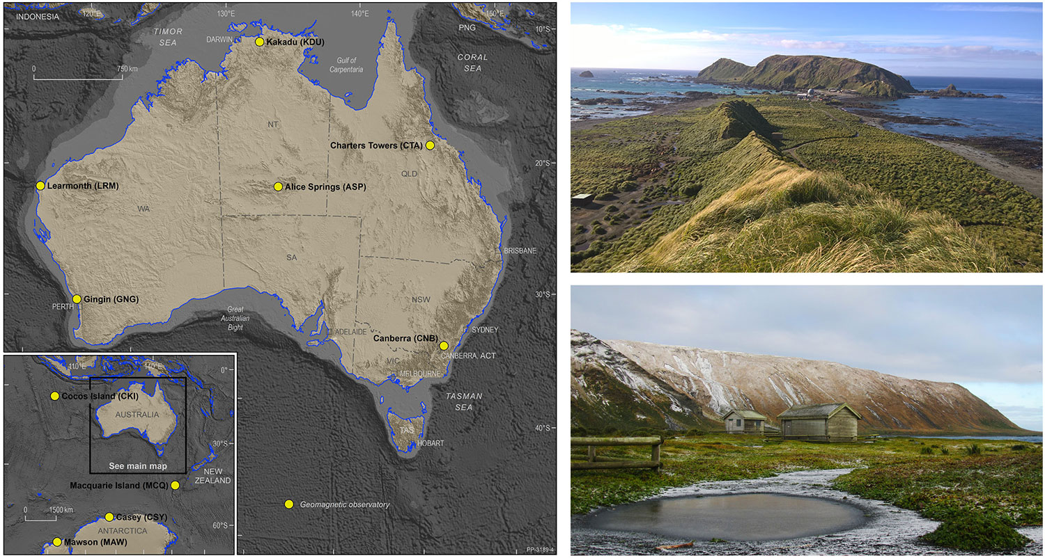 The locations of Geoscience Australia’s Geomagnetic Observatories. Top right: Macquarie Island Observatory and Station. Bottom right: Macquarie Island Observatory (MCQ)