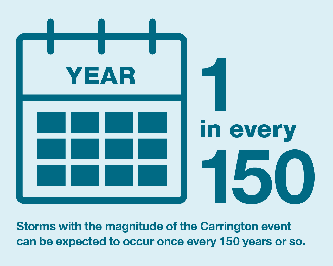 Although the probability of an extreme geomagnetic storm occurring is low, it is almost inevitable that one will occur eventually. Geomagnetic storms the size of the 1989 one occur roughly once every 50 years, while storms with the magnitude of the Carrington Event can be expected to occur once every 150 years or so.