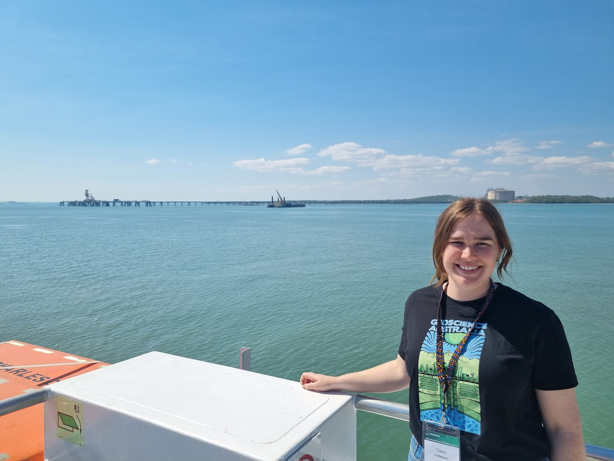 Low-carbon geoscientist Claire Patterson stands on a boat in front the proposed Middle Arm Sustainable Development Precinct, near Darwin as a part of an International CCS Summer School
