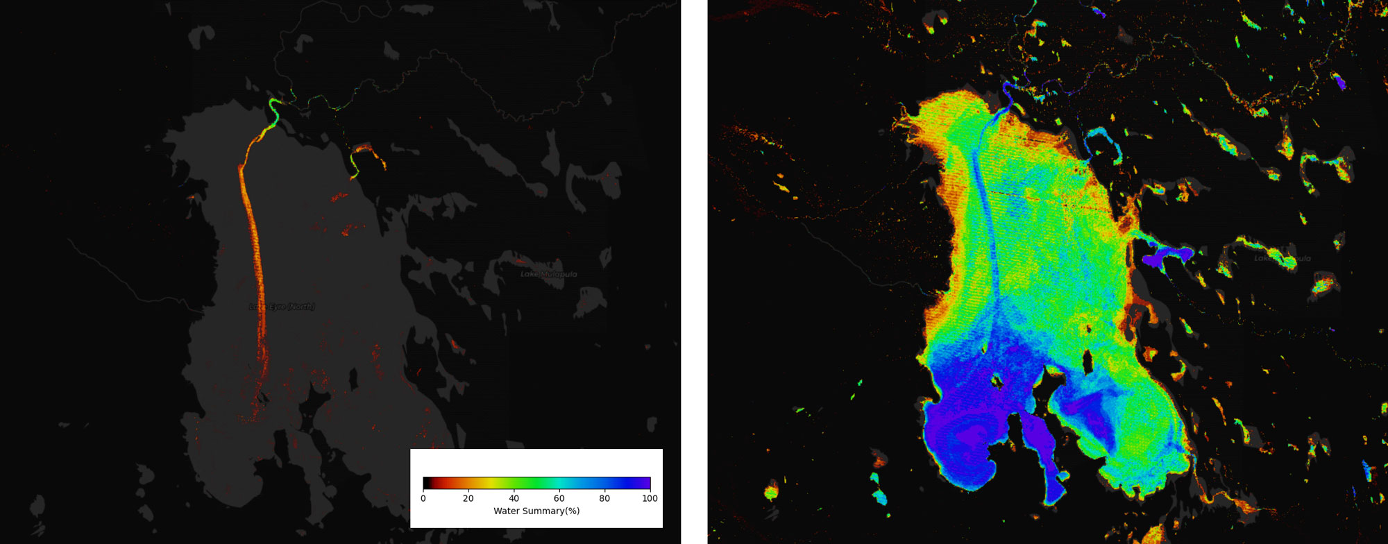 Left: The annual Water Observations summary for 2019, showing the diminished extent of Lake Ngami. Right: The ‘all-time’ Water Observations summary showing the long-term extent of Lake Ngami. Colour ramp shows the frequency of water observations.