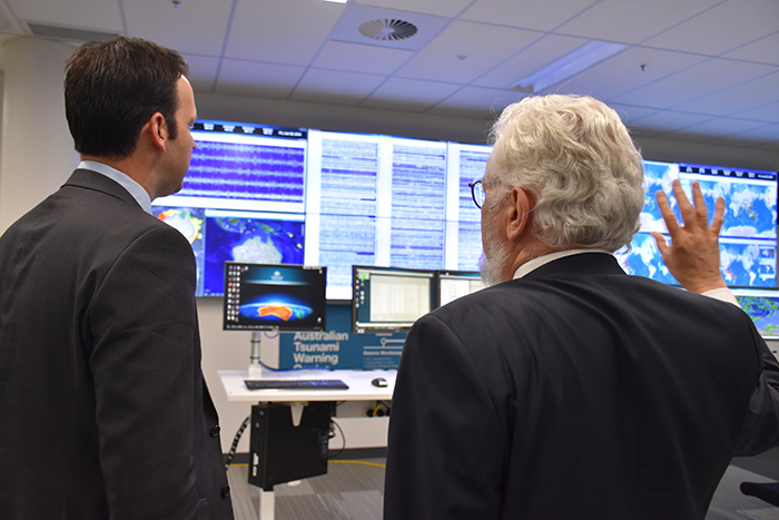 Senator the Hon Matthew Canavan touring the National Earthquake Alerts Centre with Dr Andy Barnicoat, acting CEO at Geoscience Australia